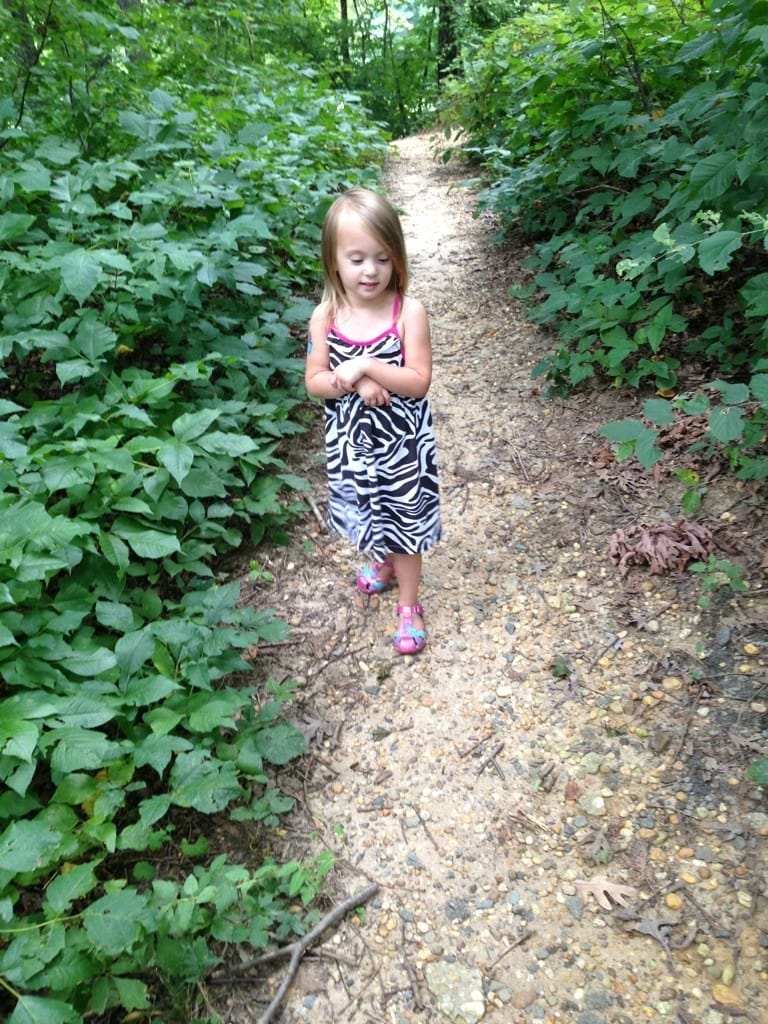 We took a break from the playground to walk around the lake. Not content to stay on the paved area, I took us off the beaten path, up the hill to the trails.