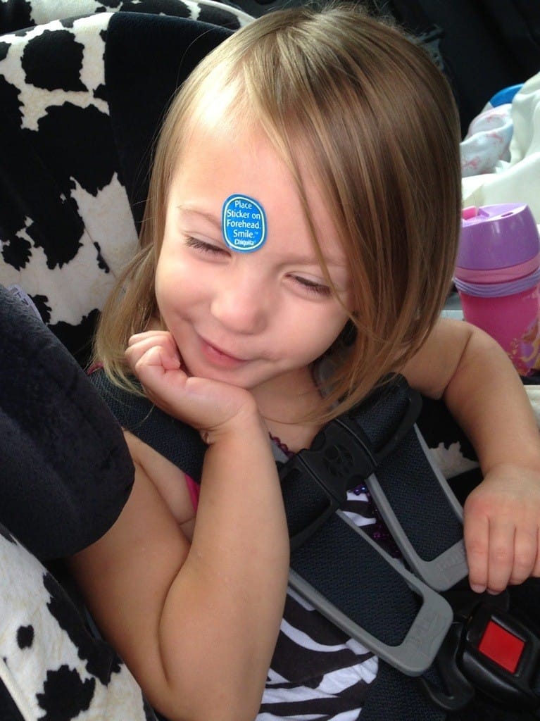 “Place sticker on forehead. Smile.”