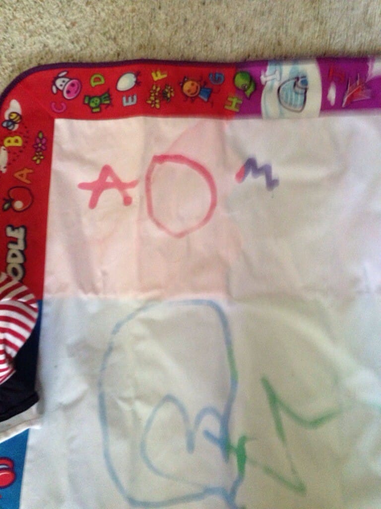 Without any prompting, I drew an “A” on my Aquadoodle. Mommy was very excited, so I also drew her an “O” and an “M”.