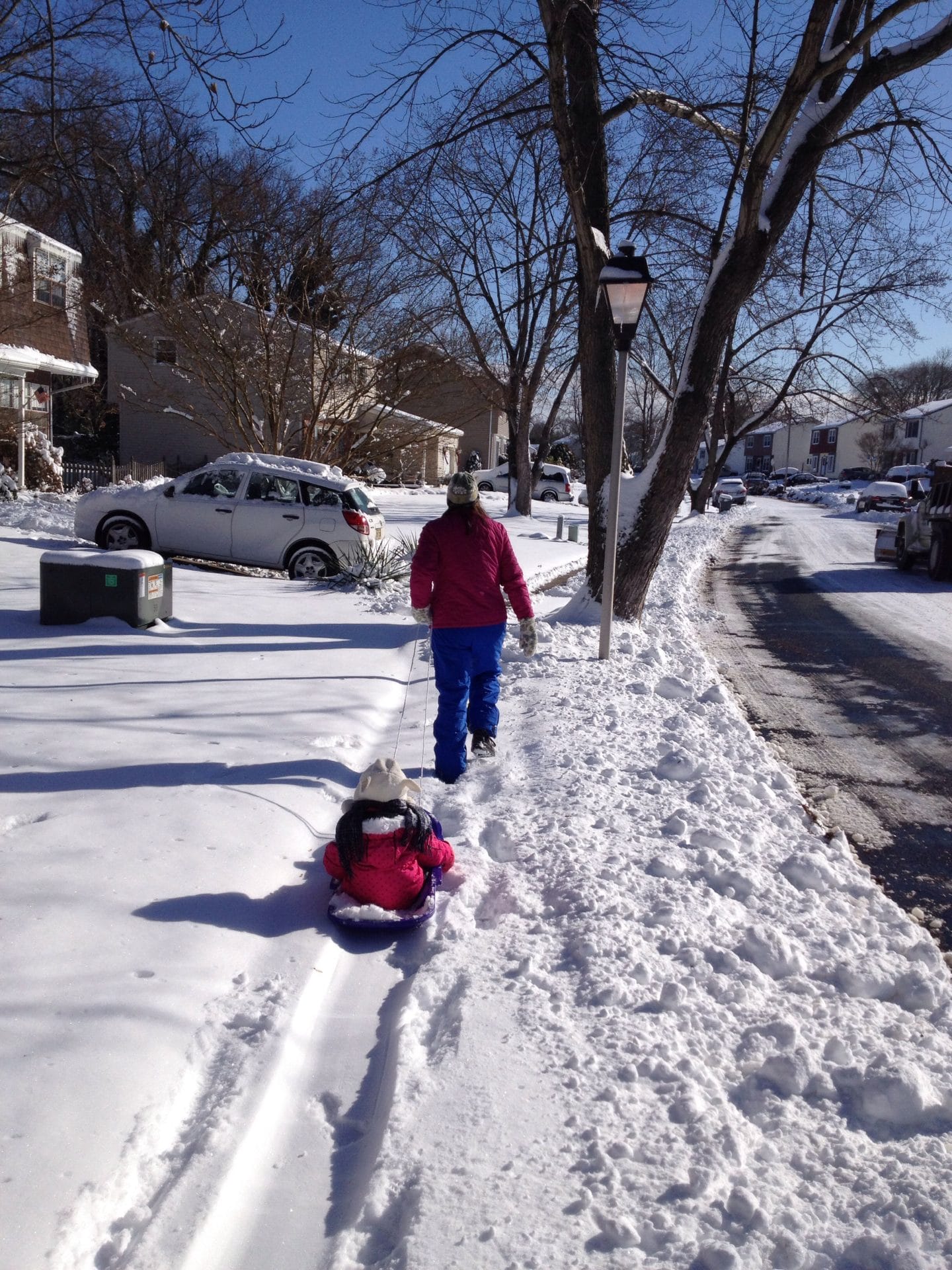 Mommy is pulling me in my sled. She looks funny in dad’s old snow pants, but she’s warm. Now mush!
