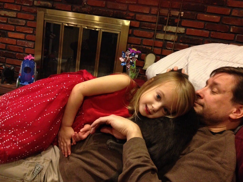 Today was “dress to impress” day at school, so I wore my beautiful red dress. Now I’m home snuggling with my daddy & Charlie.