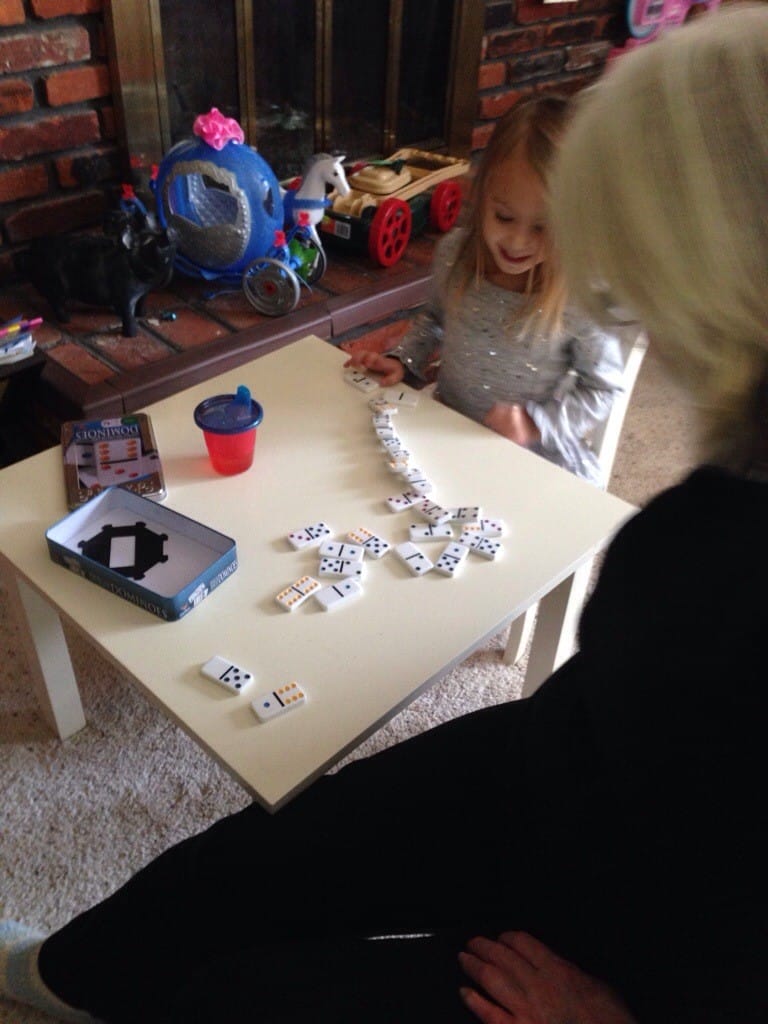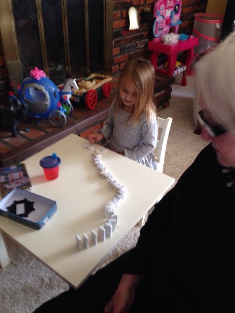 Grammy & I set up my dominoes, then mommy watched as we toppled them all.