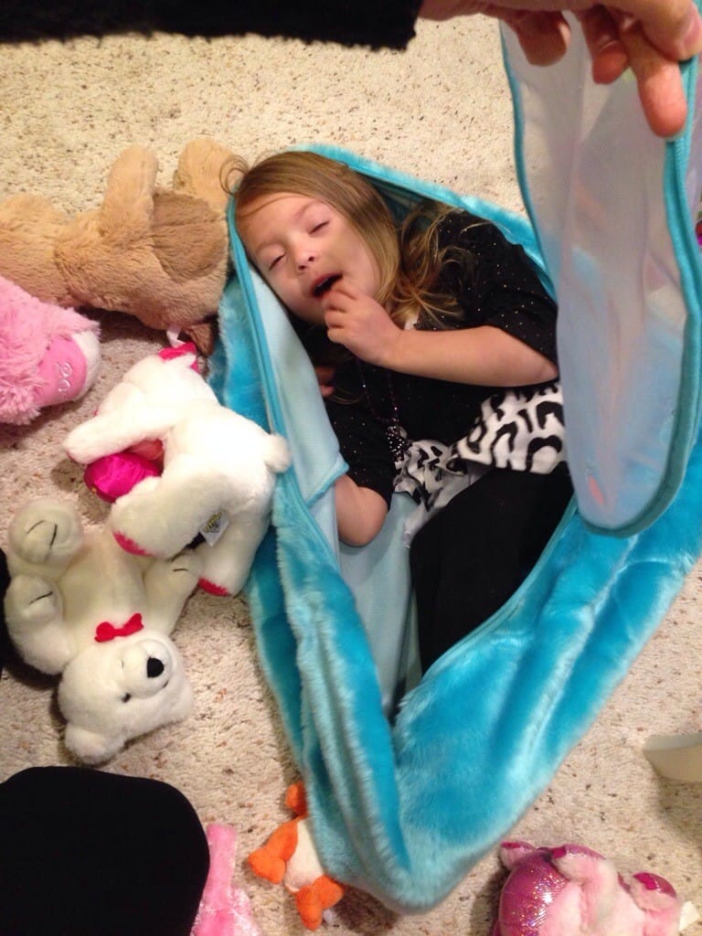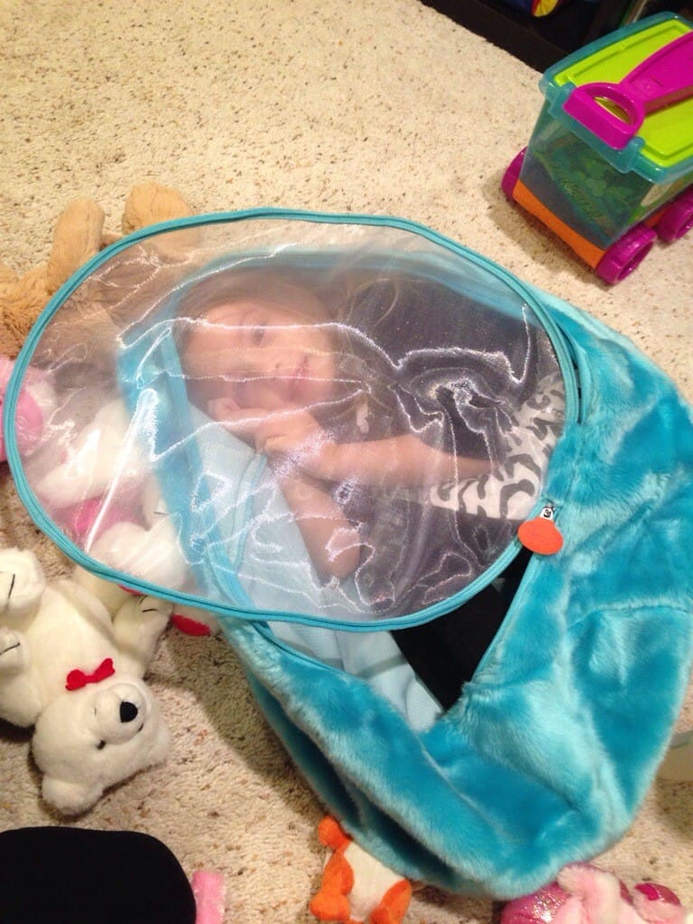 I took all my stuffed animals out of my animal bag… Then I climbed in!