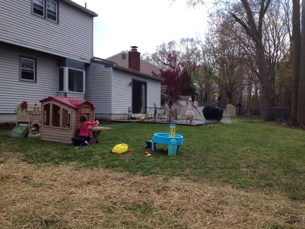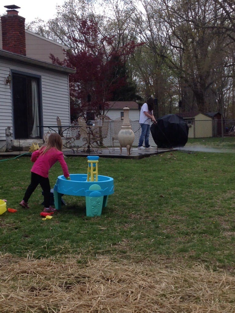 While mommy power washes the patio. I used my squirt bottle to clean my house and slide. Now I’m playing but mommy is still working.