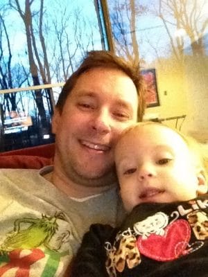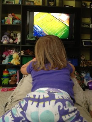 Sitting on dadWatching Disney's "How to play football" while sitting on dad.