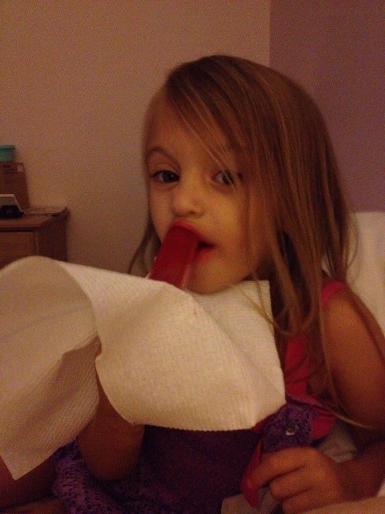 I like Popsicles. But I do tend to be rather messy. So when I wanted to eat one with mommy in her bed on daddy’s side – dad made sure I wouldn’t drip.