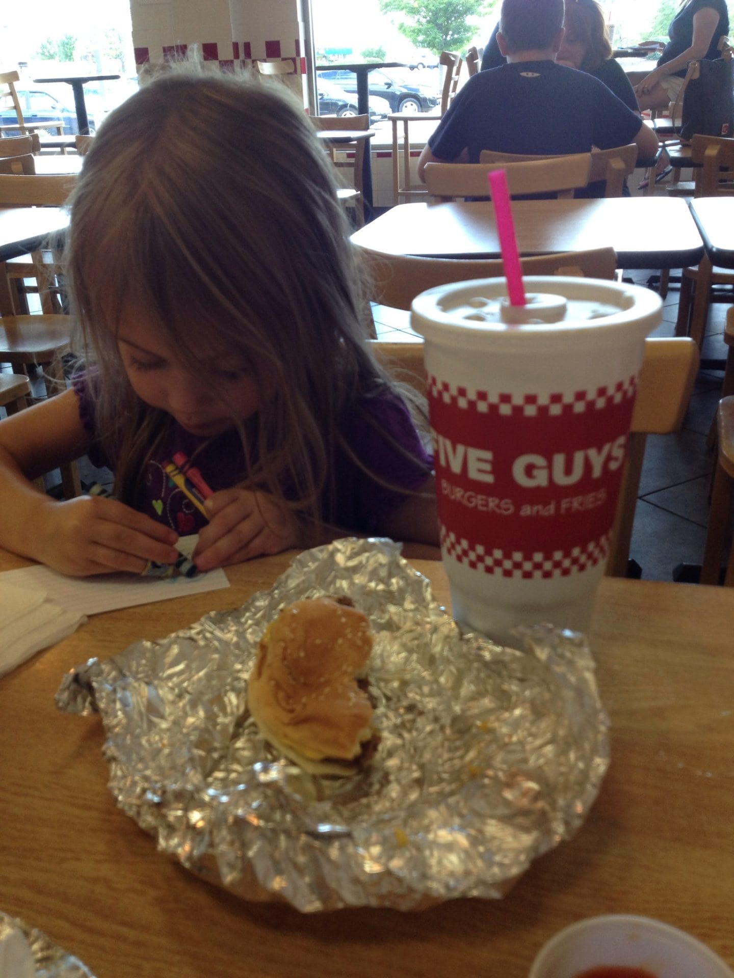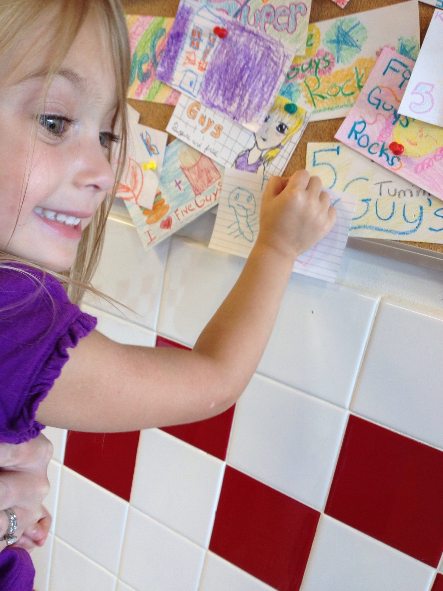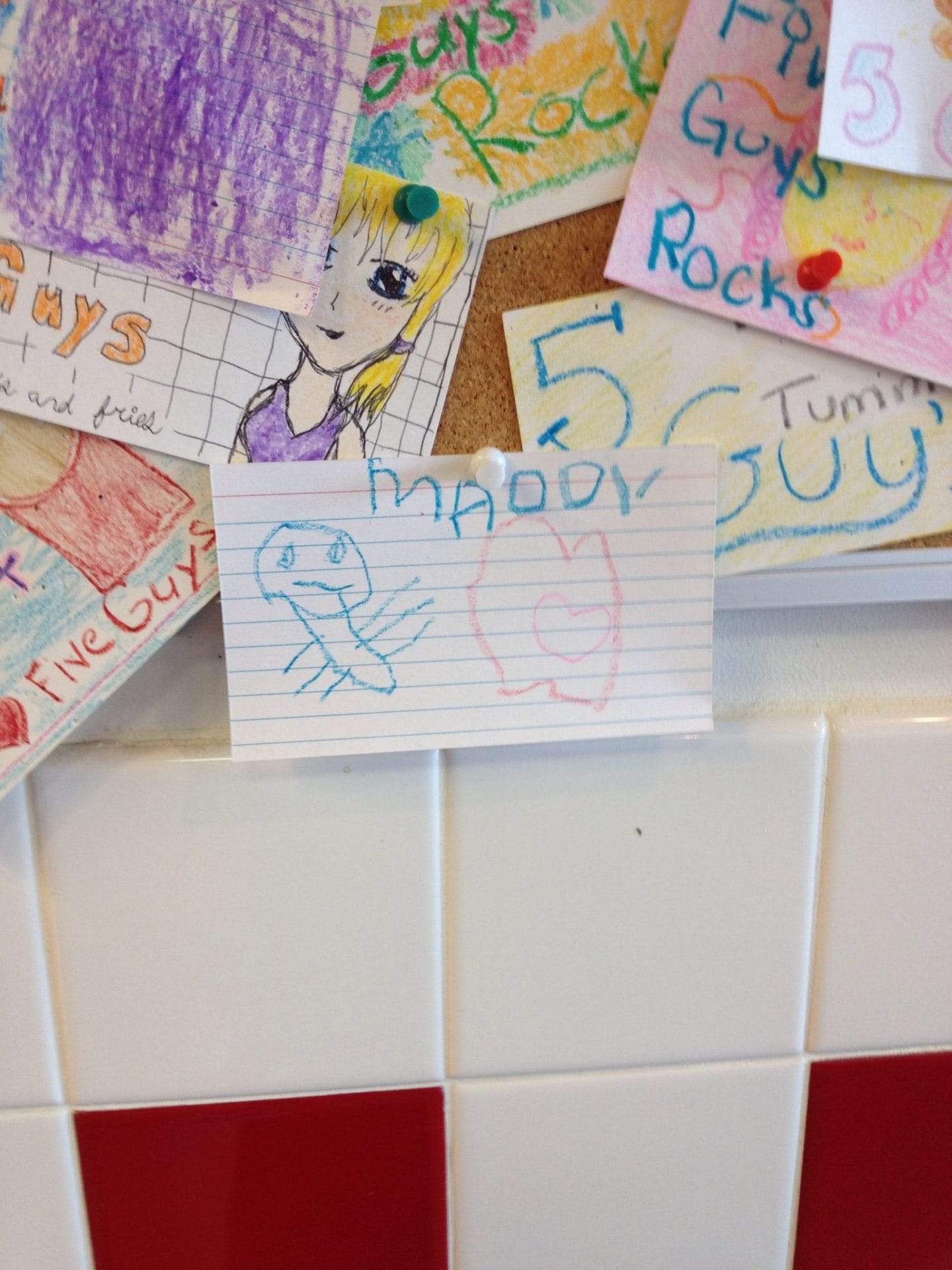 Refueling by wlevins | Aug 24, 2014 | 3yrs-4yrs Old It was time to refuel. So we stopped at five guys in Moorestown. Yummy. I even drew a picture for their wall. Related Posts YummyMommy makes yummy dinners. DancingLook at me I'm dancing. PostPosty post post post post.