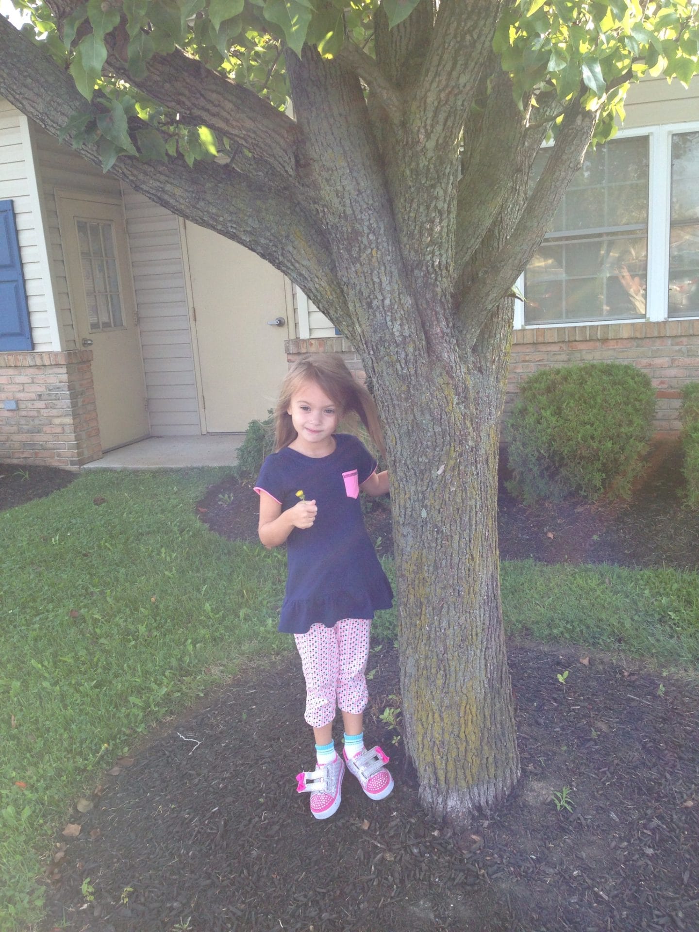 This tree outside my school is my favorite. I asked mommy to take my picture with it this morning. I even posed with the dandelion I picked for mommy.