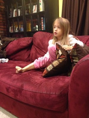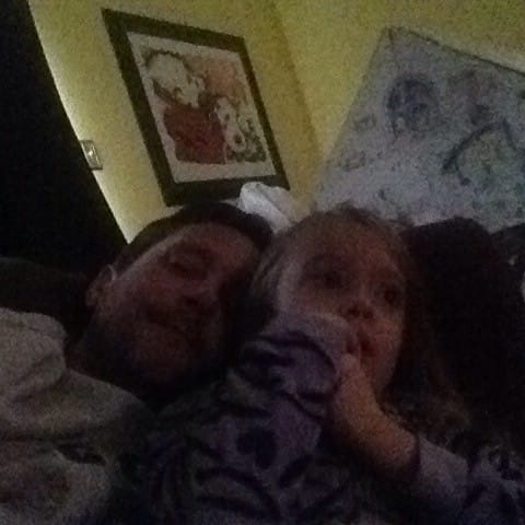 I woke from my nap at school coughing. So dad came to pick me up. Now we’re in our Jammies snuggling on the couch eating cookies and watching cartoons.