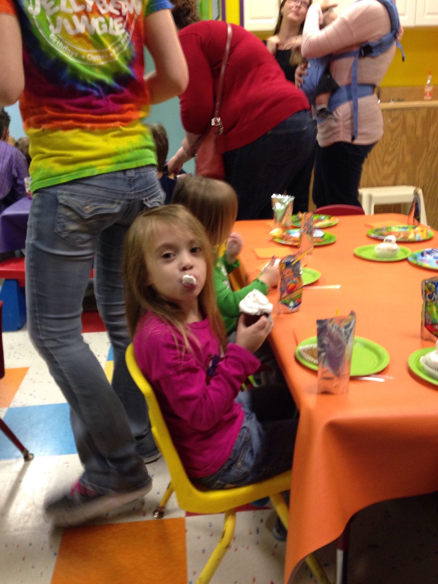 I got to go to Teigan’s “Big Hero 6” birthday party at Jellybean Jungle. I had fun playing… And I especially loved eating my cupcake!
