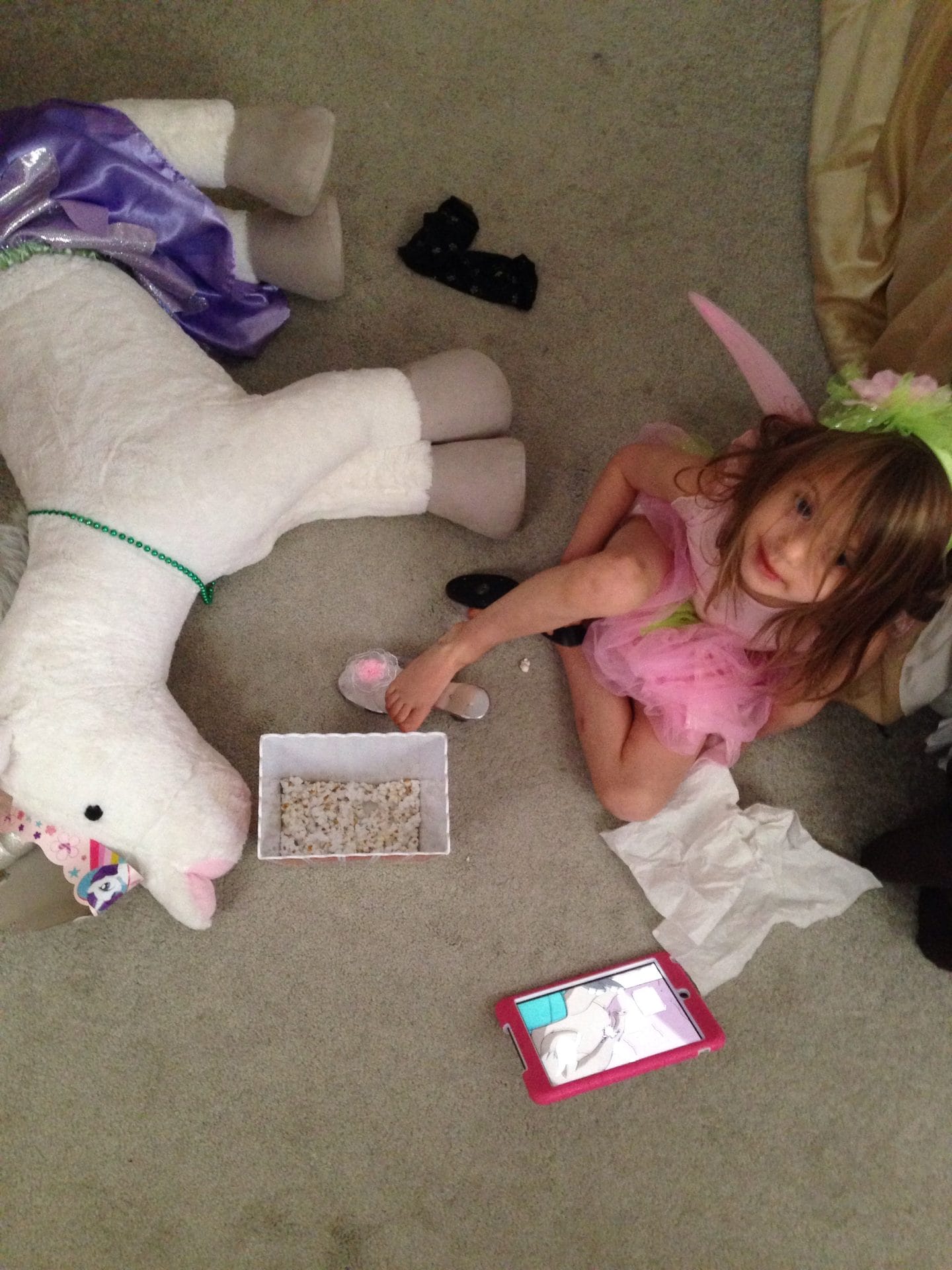 It’s Uni’s birthday, so I’m giving her a party. I dressed up in my fairy costume and mommy made us popcorn. It’s very festive!