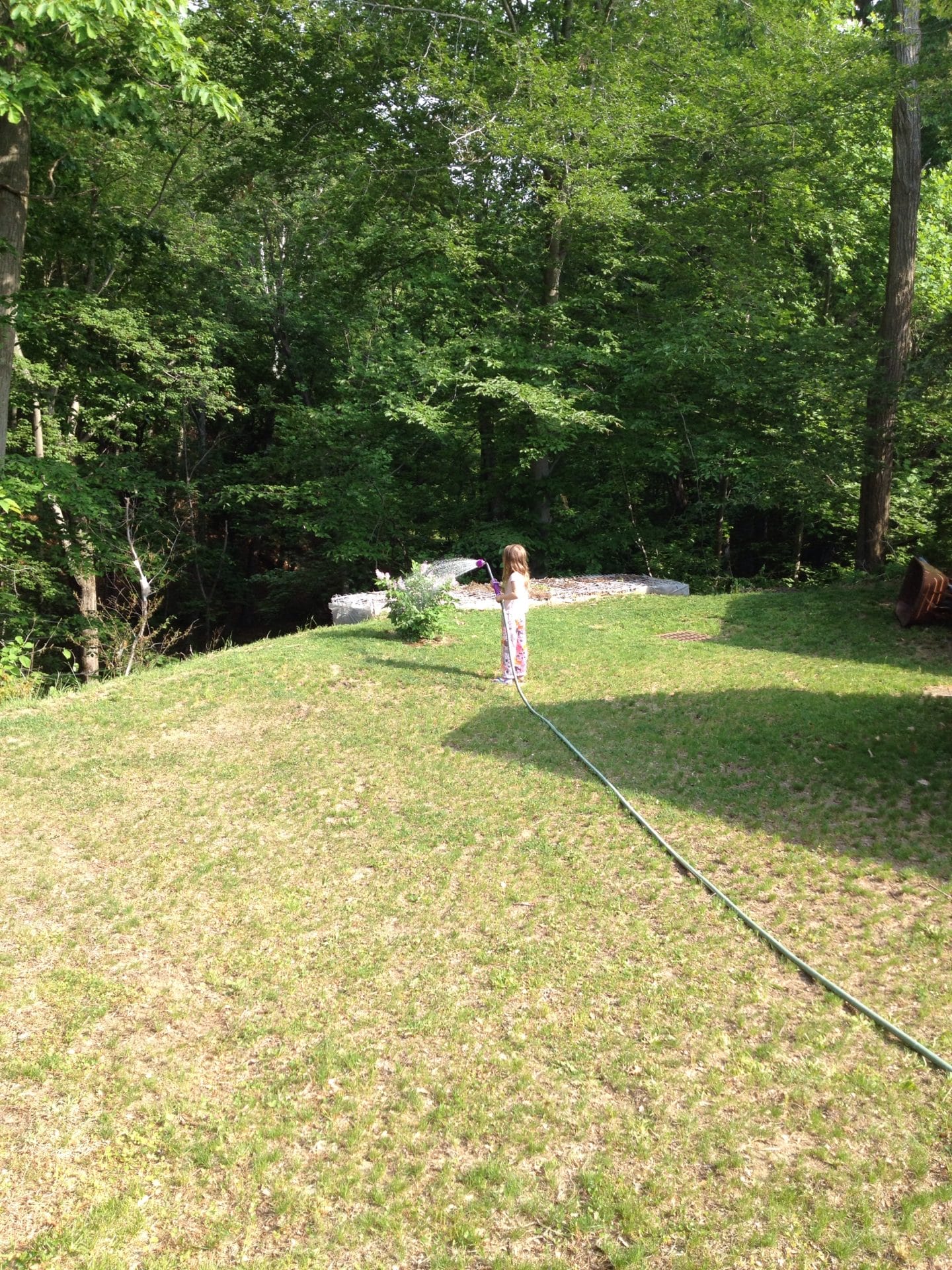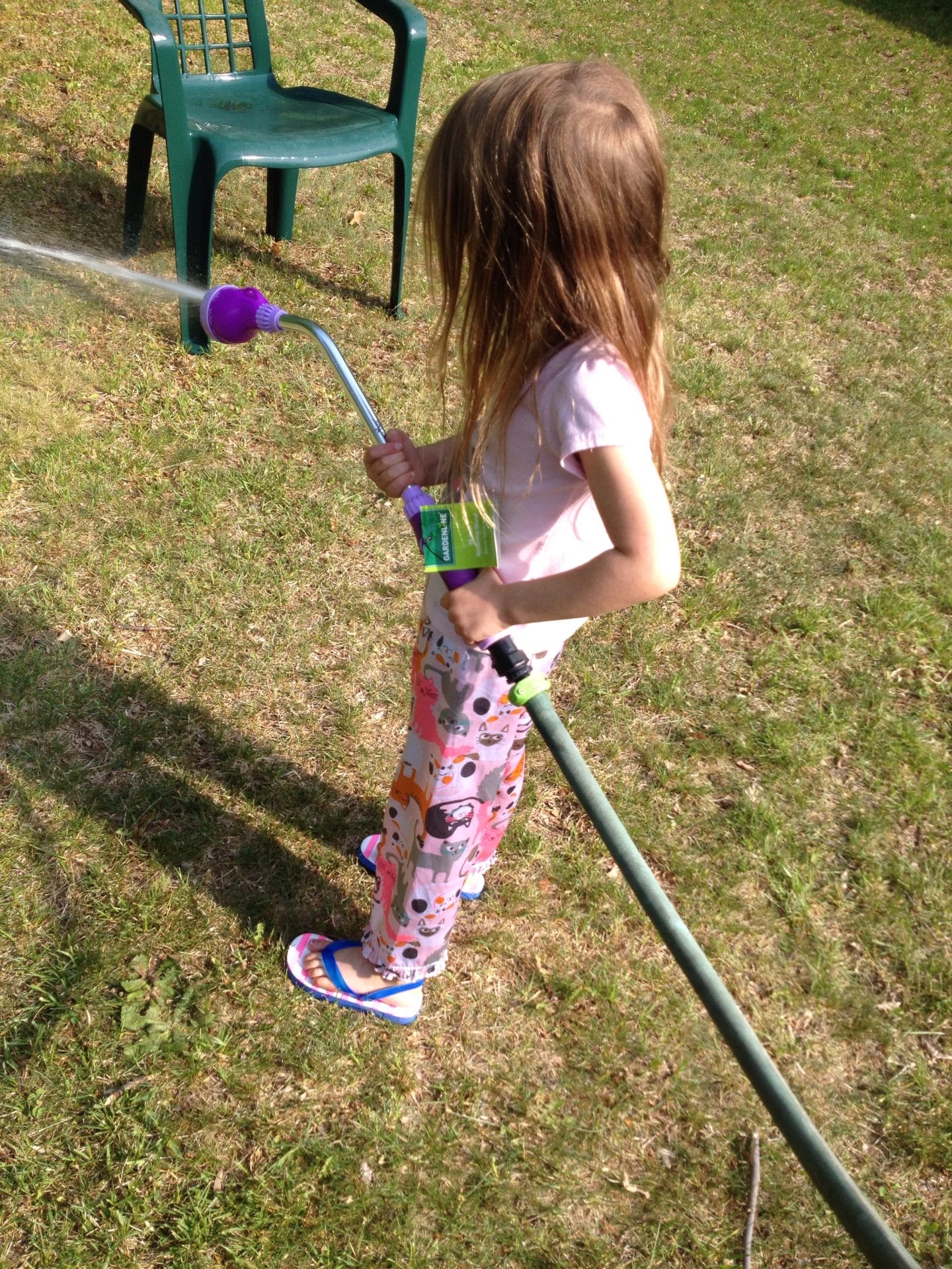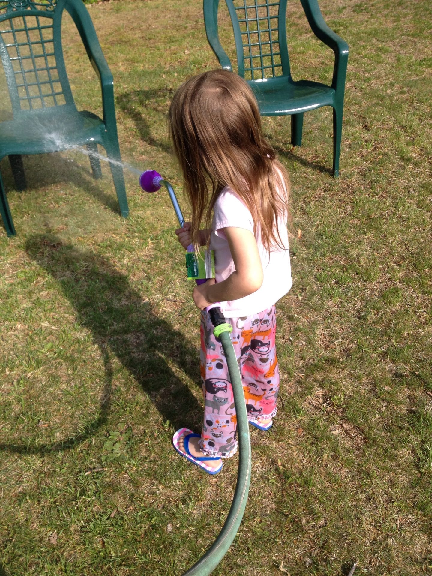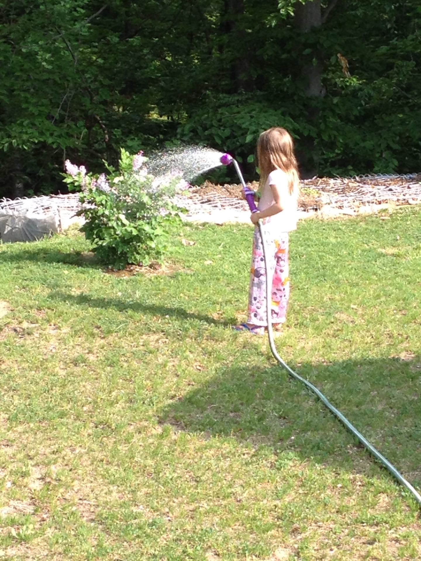 Even in my Jammies I went outside to help daddy clean the chairs for my party. Then I noticed our lilacs needs watering too.