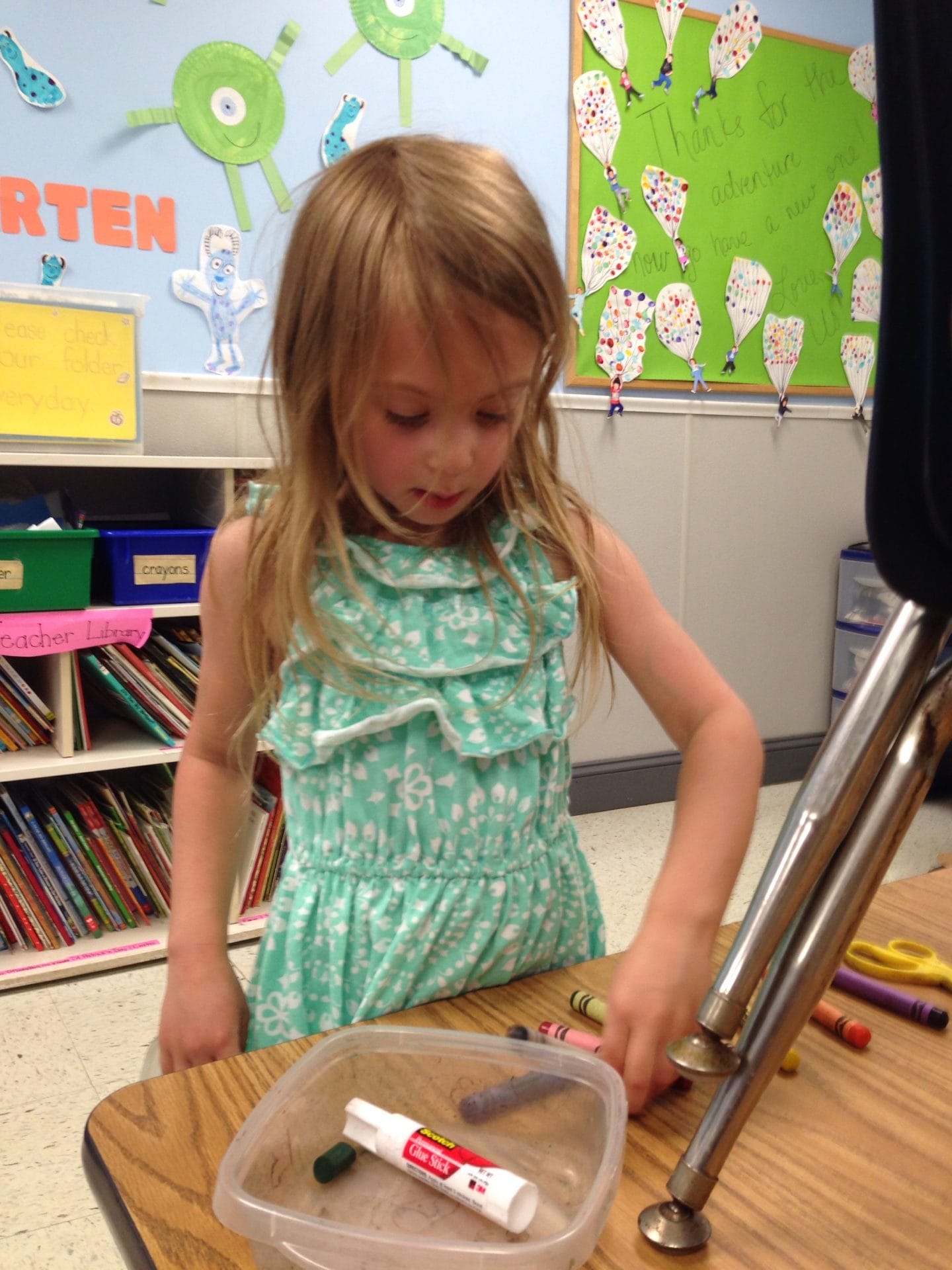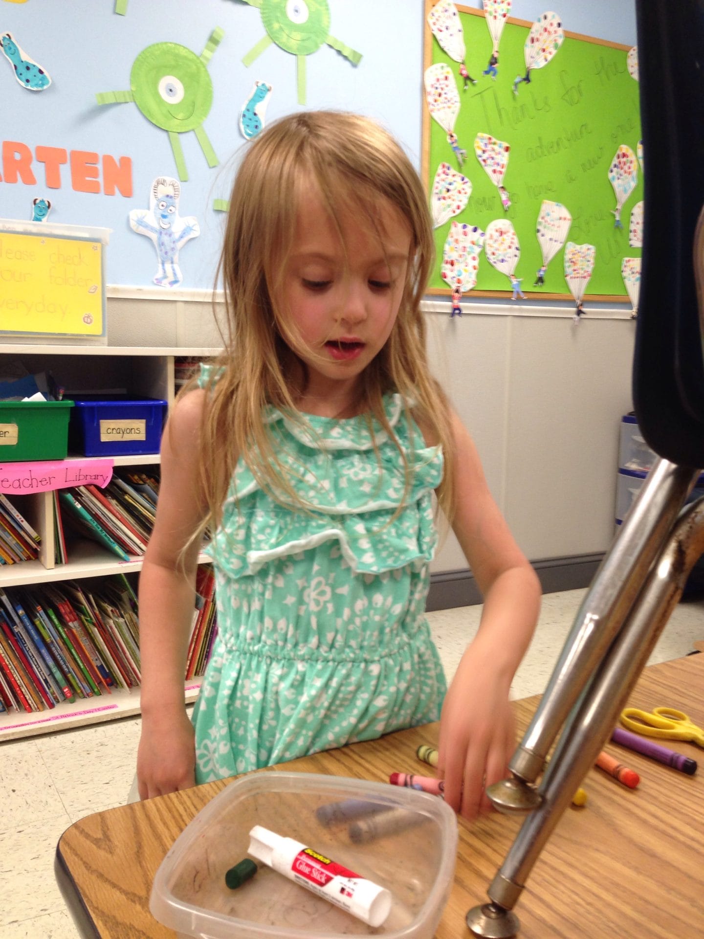 I have my own little container of supplies at school: crayons, glue, scissors. I was showing mommy how well I take care of my things.