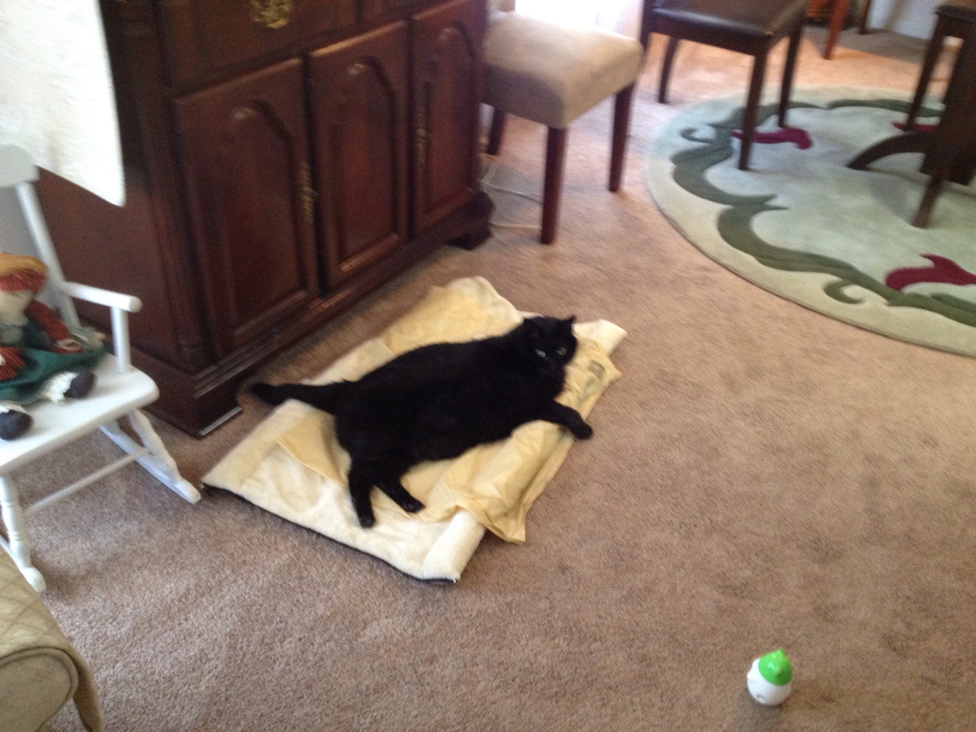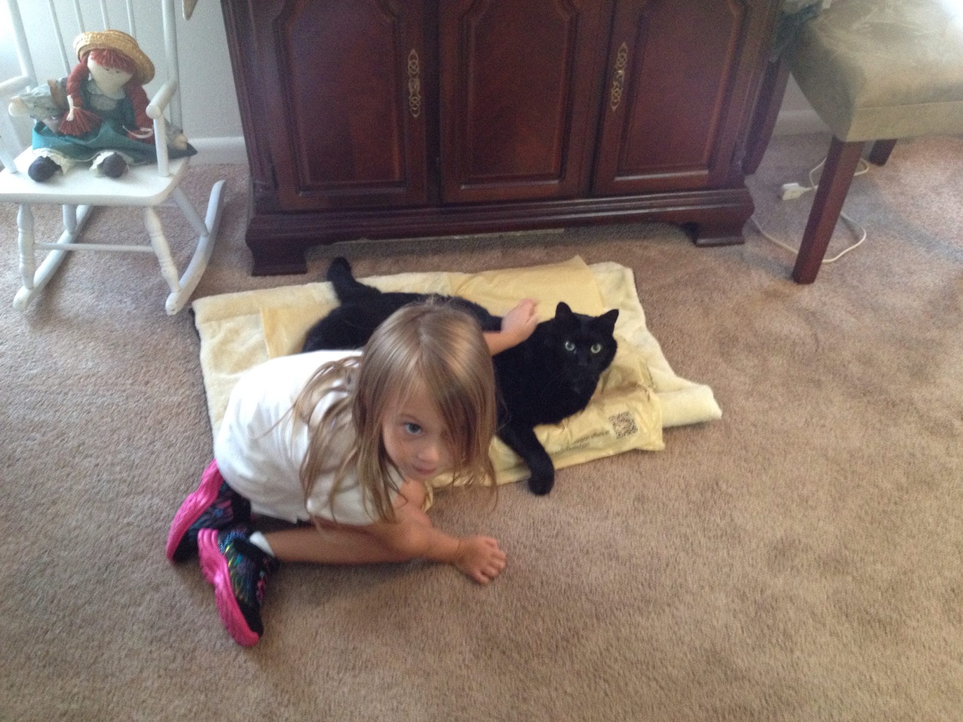 Daddy and me are taking care of Peter this week for grandmom and poppy.  I gave him treats while daddy scooped and fed him. Then we gave him snuggled.