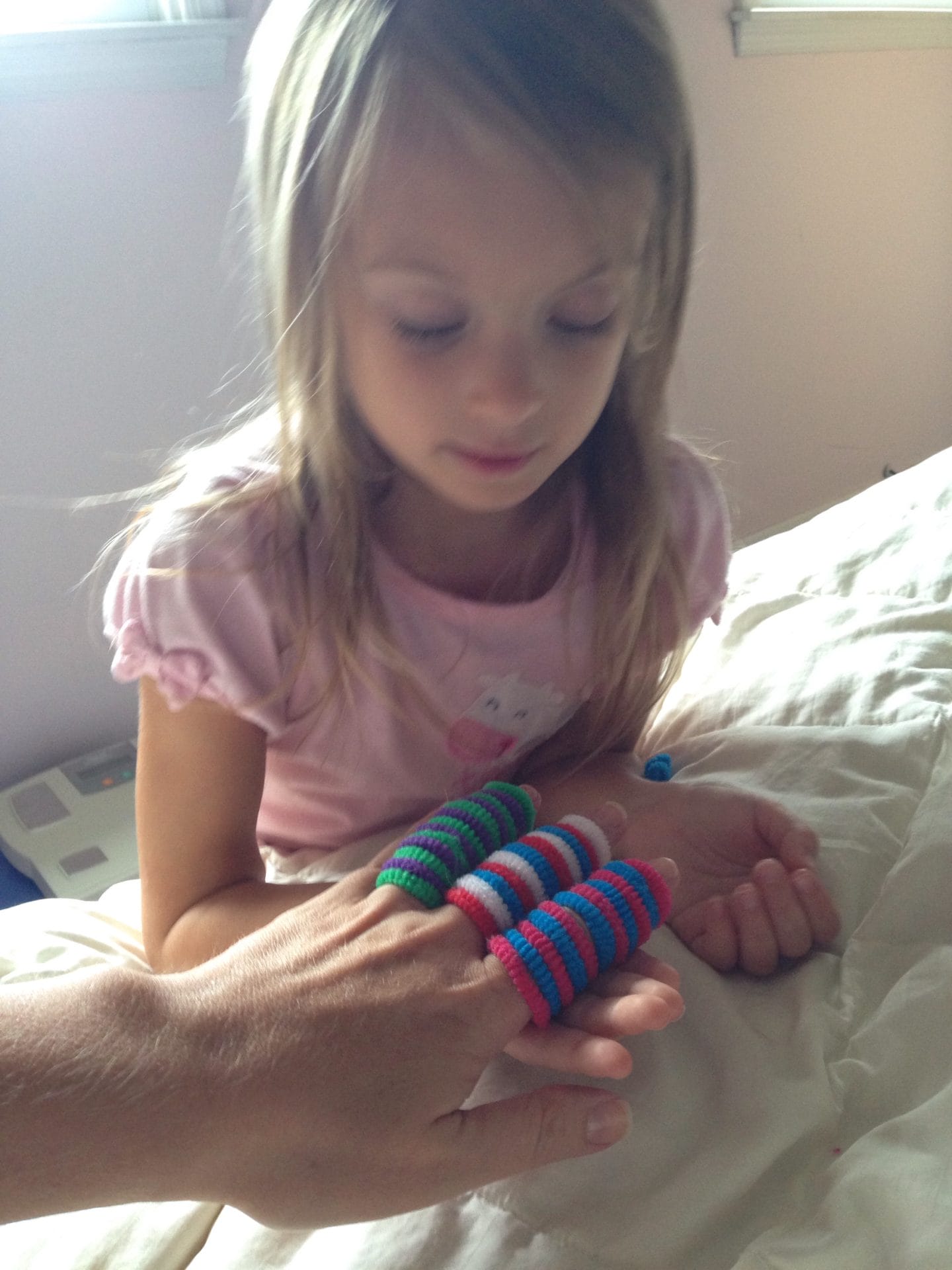 I got a bunch of my ponytail holders and put them on mommy’s fingers to make patterns.