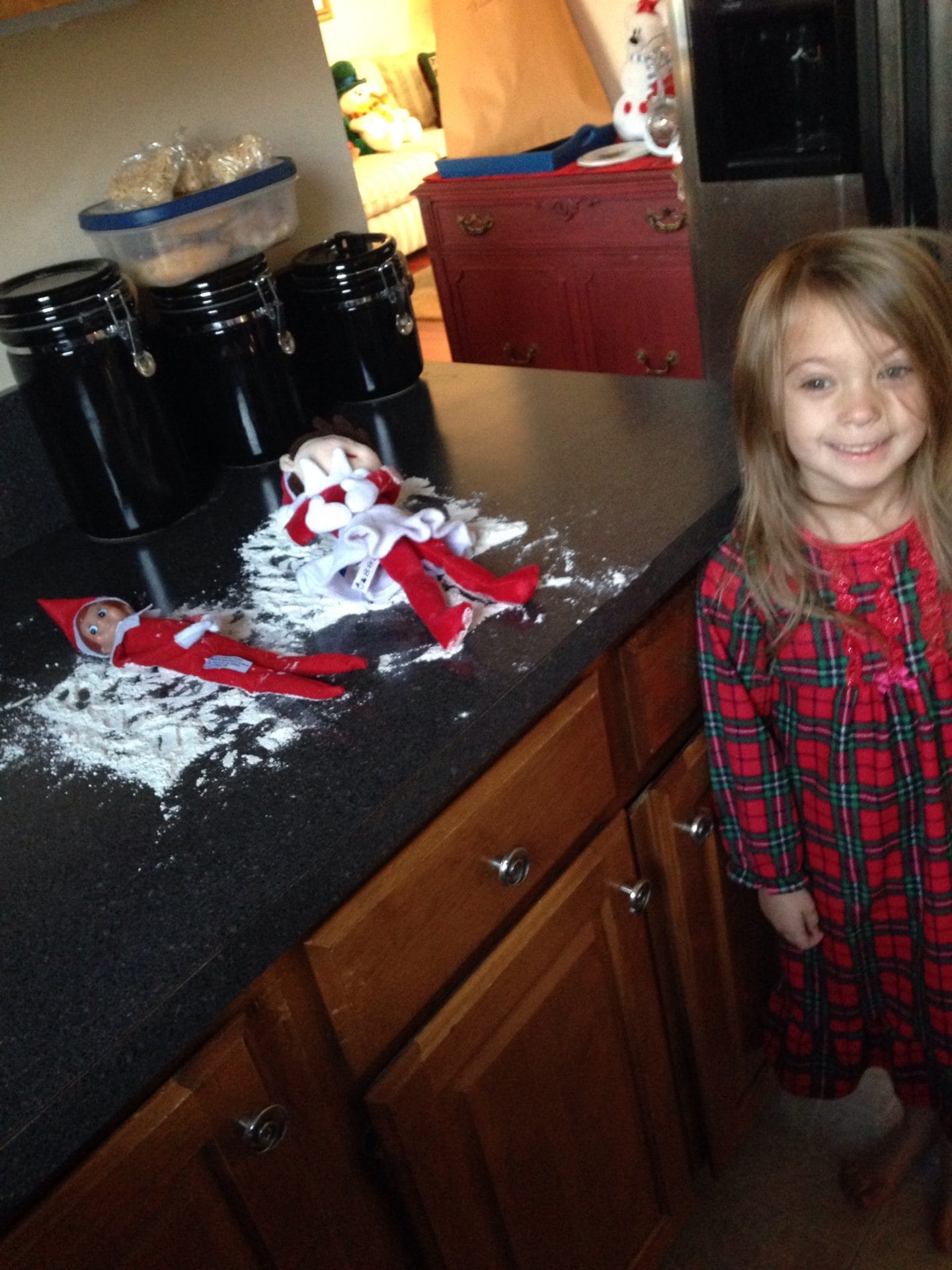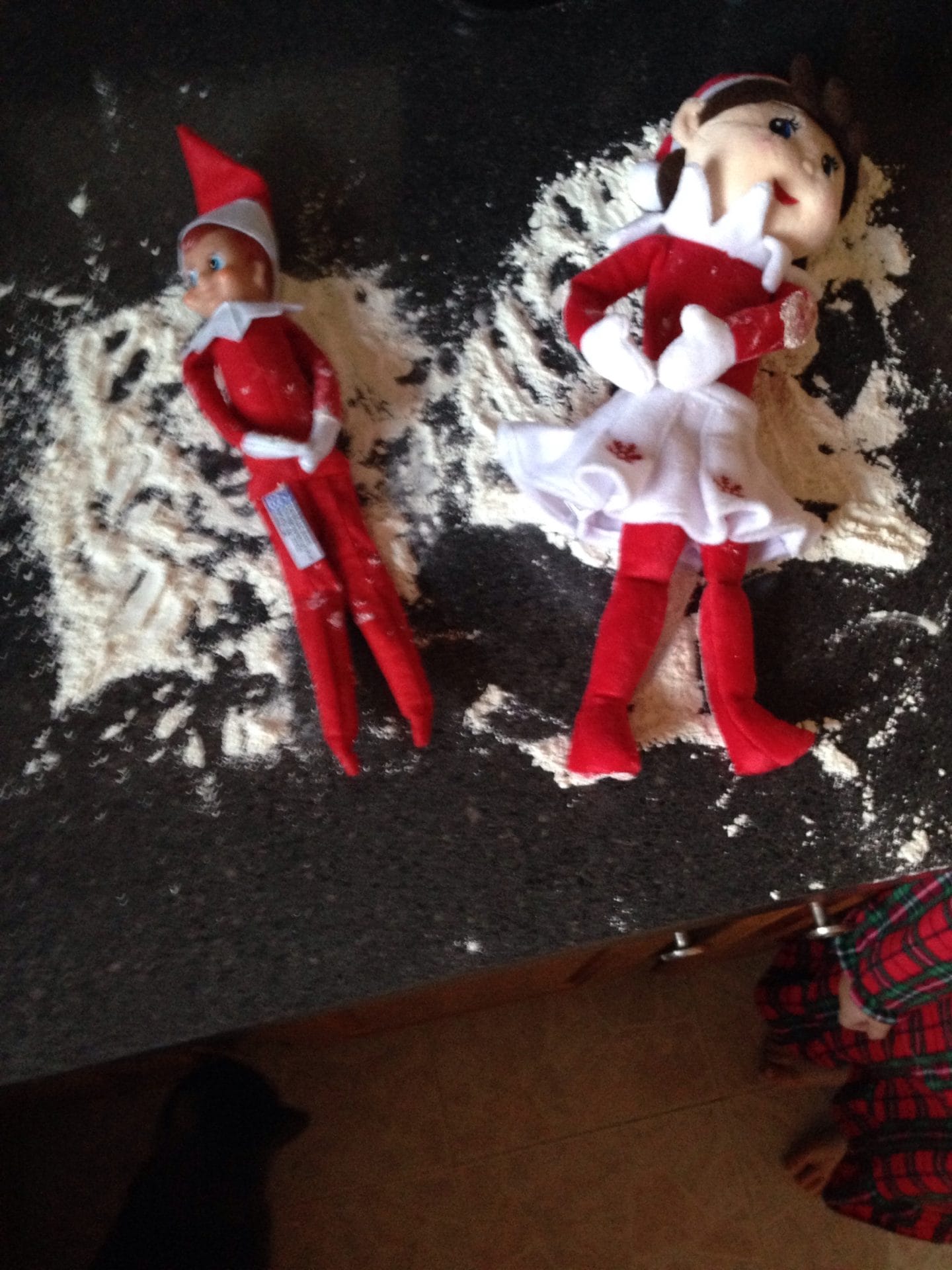 I found Elfie & Snowflake making snow angels on the counter this morning. Their snow angels weren’t very good – but they sure were messy.