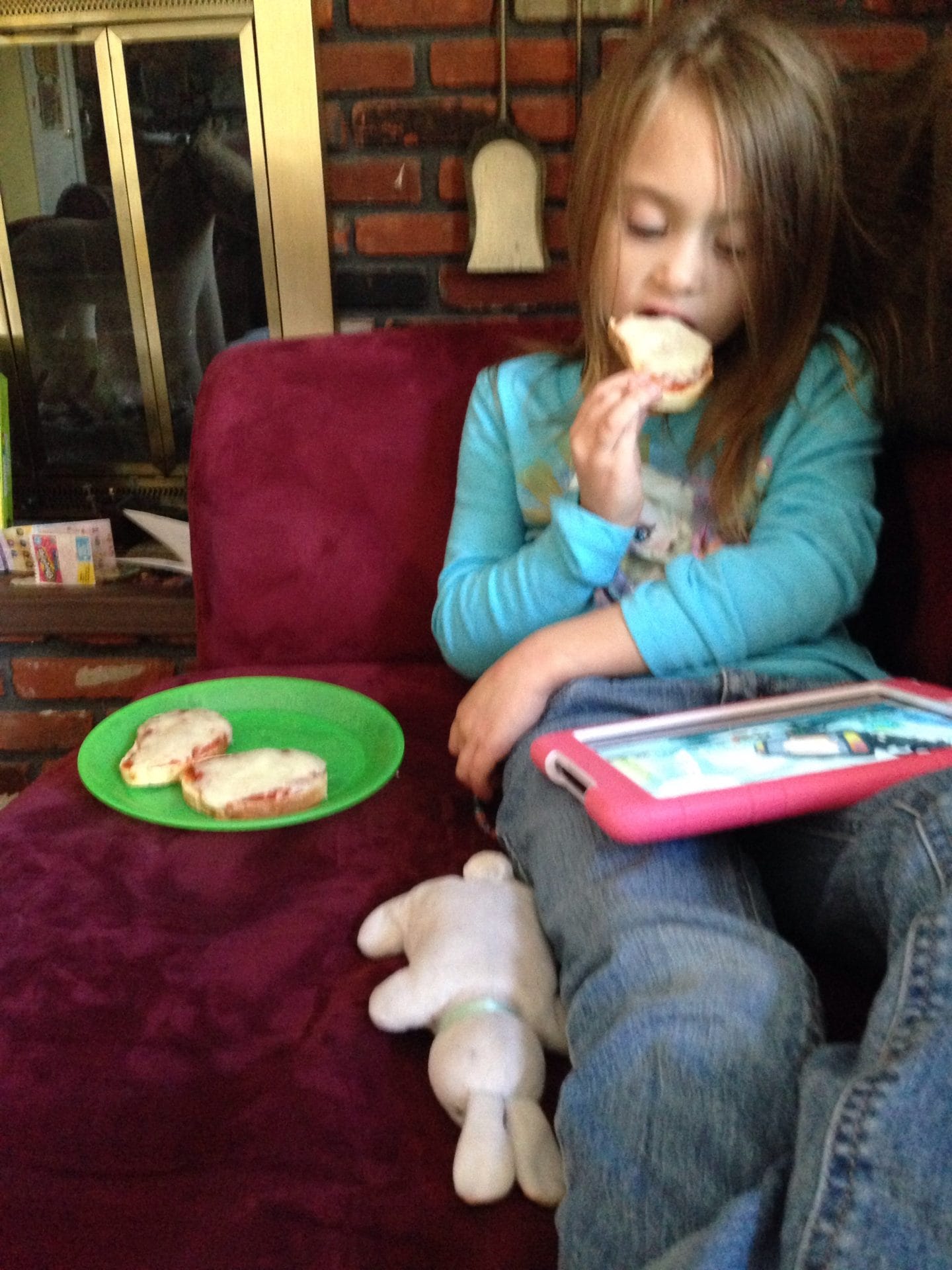 I couldn’t decide what I wanted to eat (a common issue). Mommy had some leftover Italian bread, so she added some pizza sauce and mozzarella cheese, put them in the toaster oven, and bam… Tiny pizzas.
