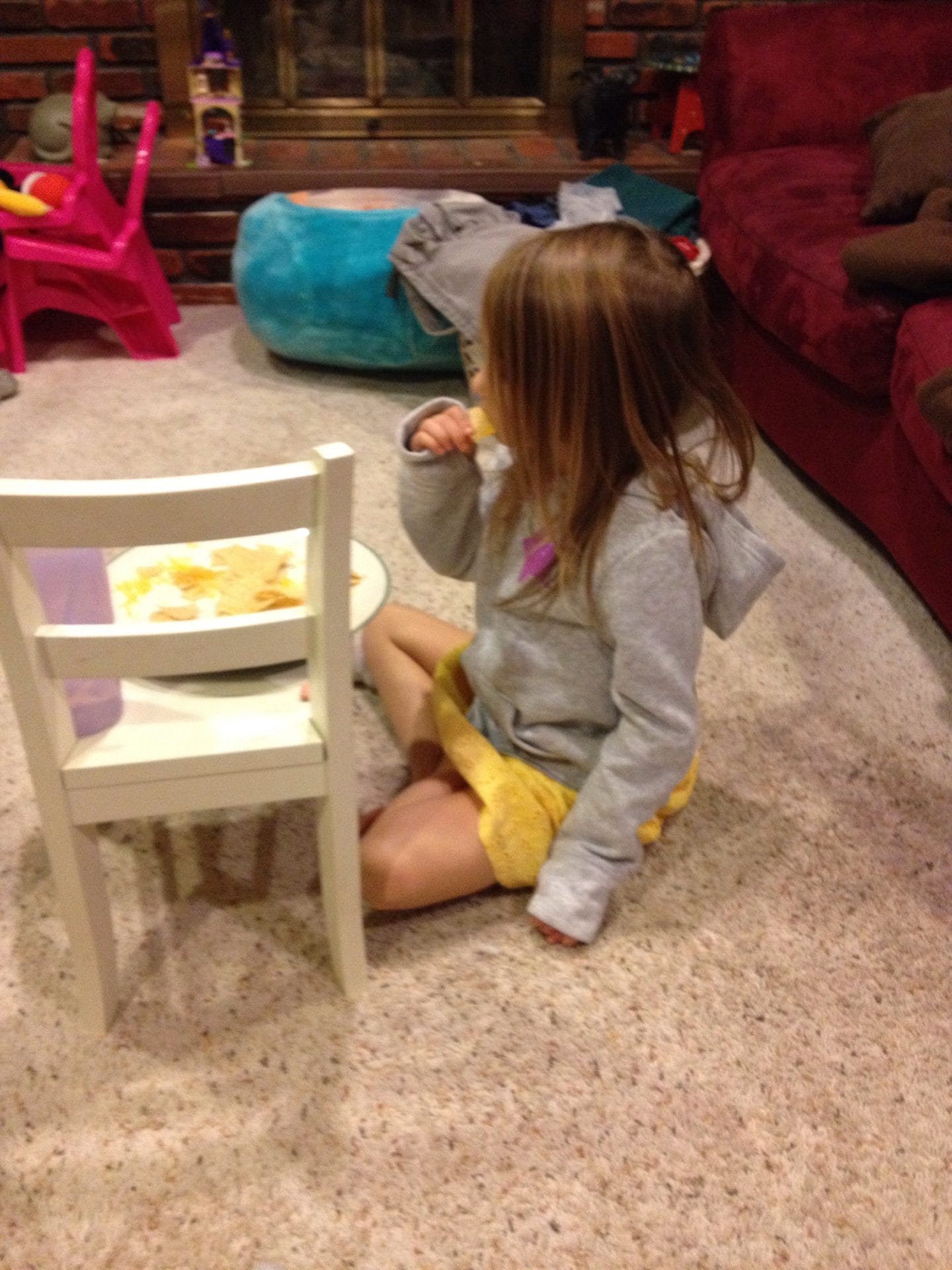 My school was closed today so I hung out with mommy. And when daddy got home he found me wearing a summer dress eating cheesy chips.