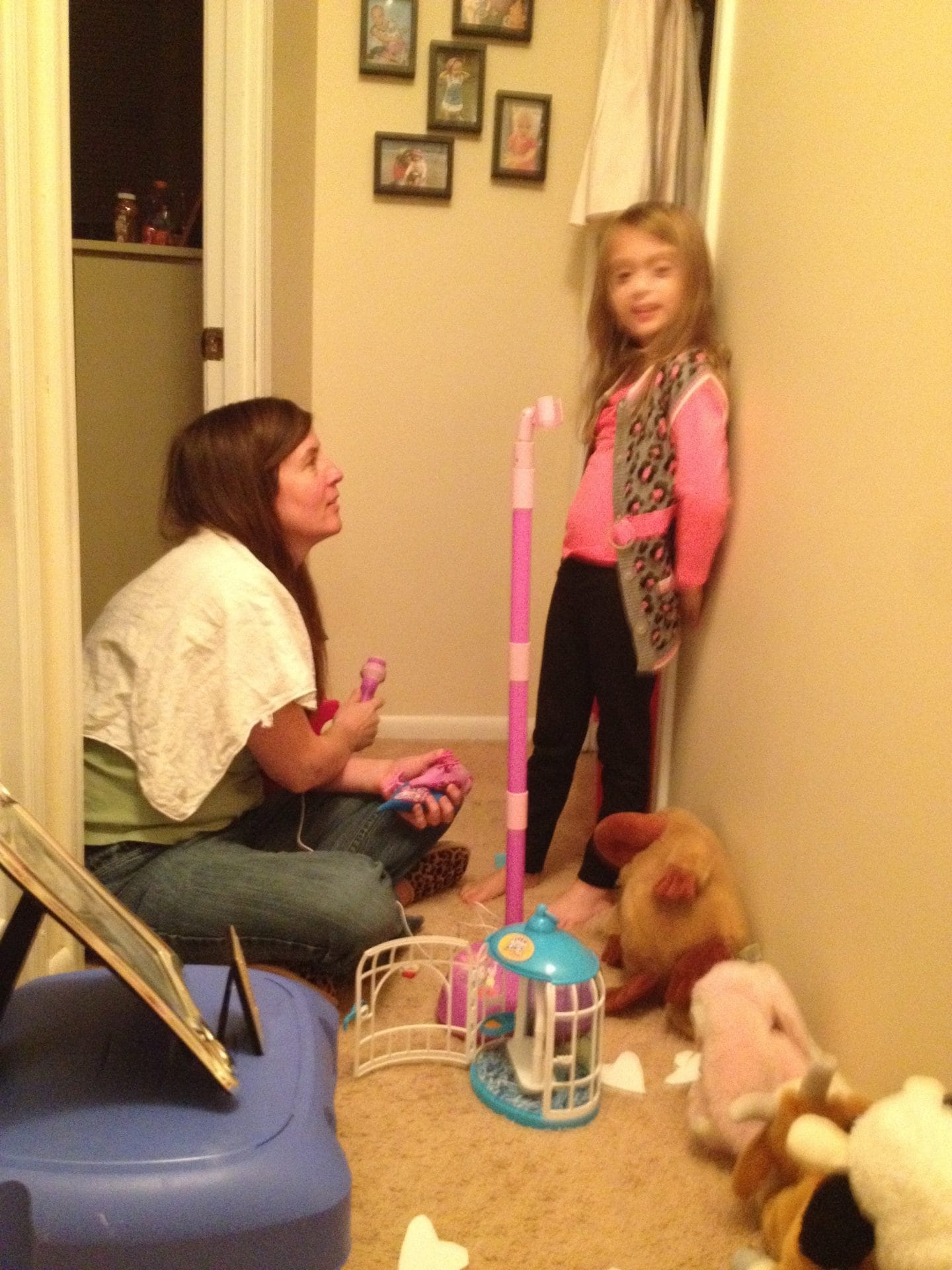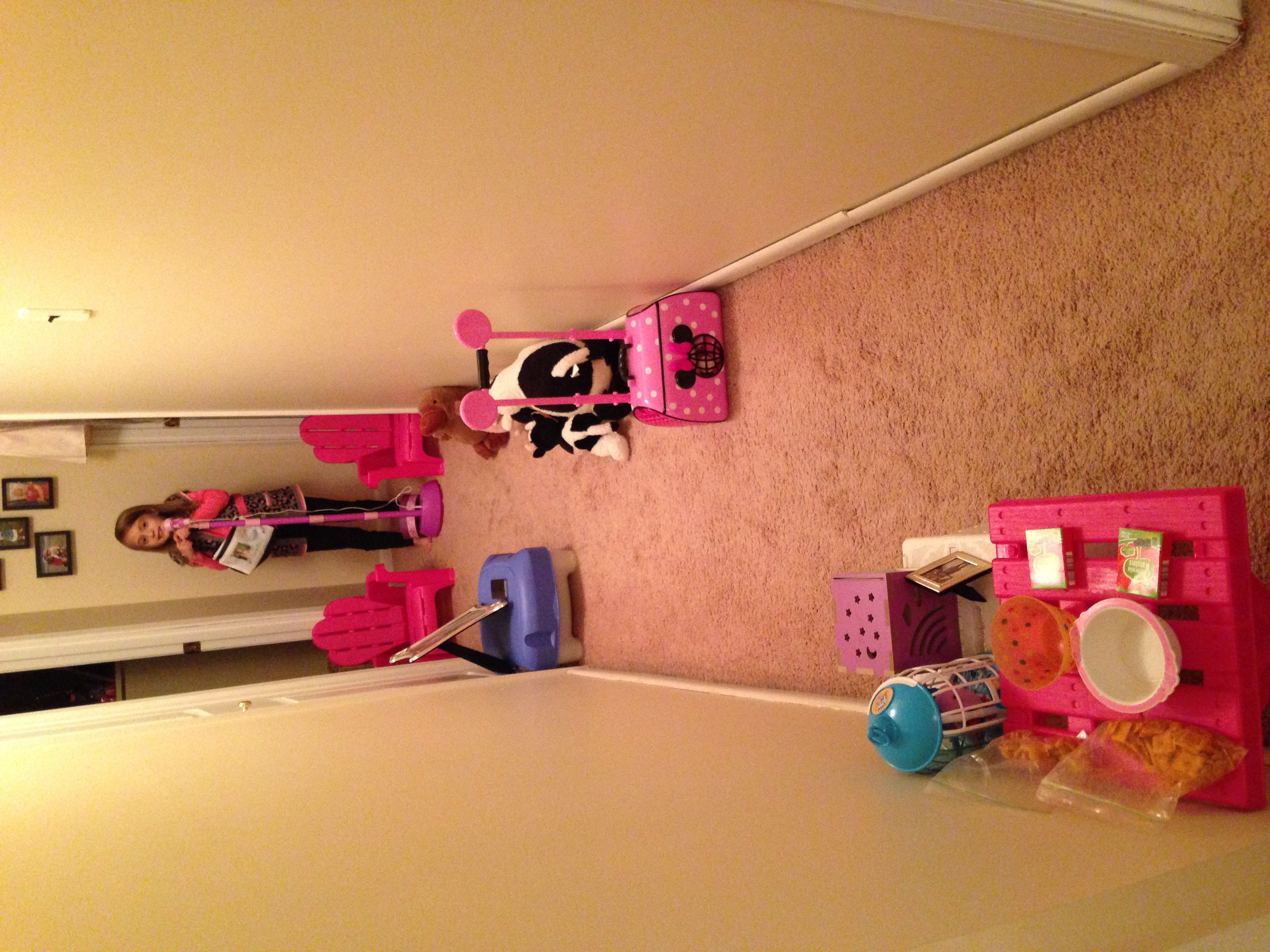 I prepared a wonderful party in our upstairs hallway. I had a petting zoo, snacks, music, and we even picked a king and queen of the party. Monster the cat won king… and Mommy won queen.