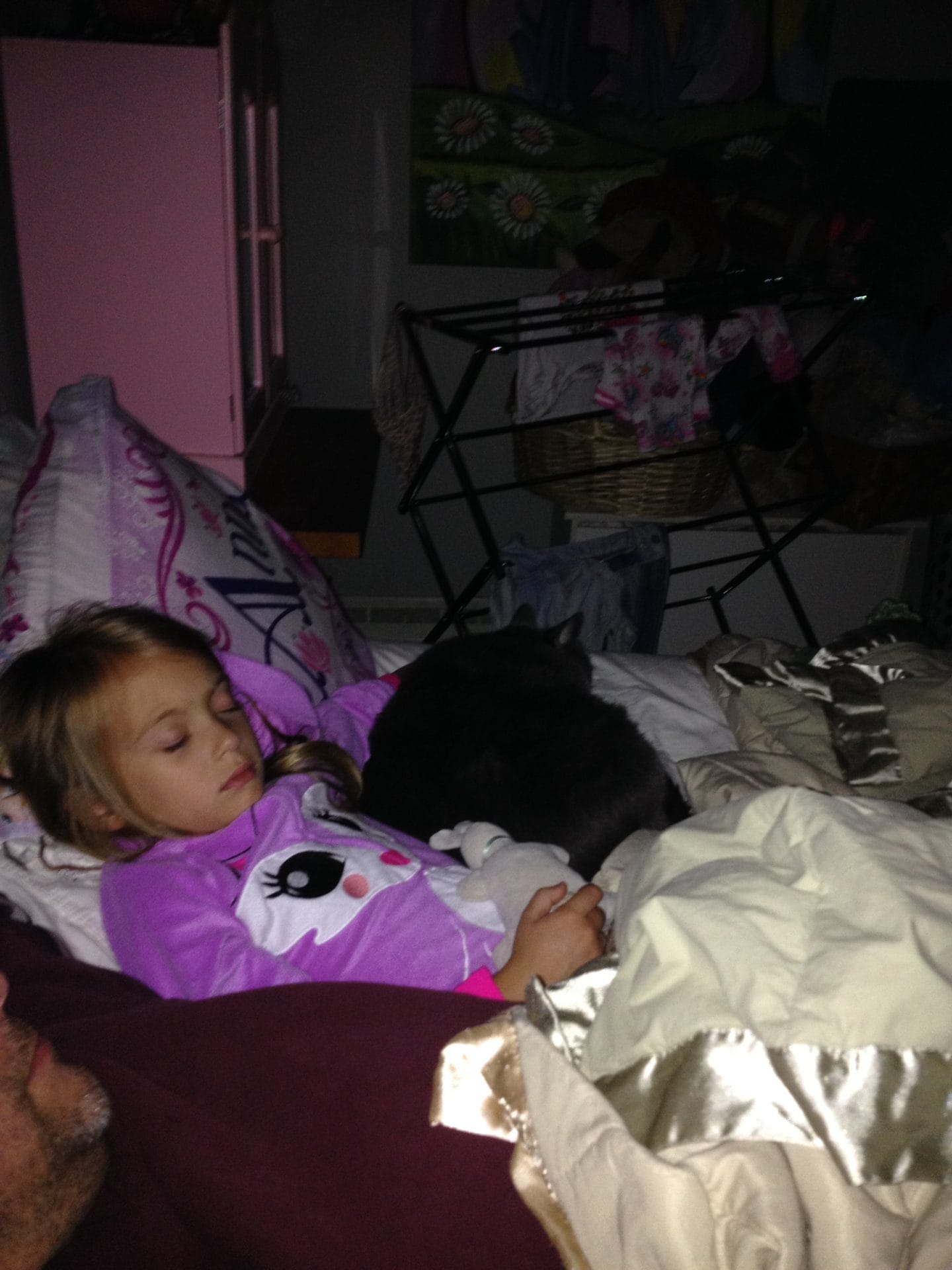 I was having trouble falling asleep. So dad and I and stinky are snuggling in the guest room. I was so happy to go to sleep with stinky snuggling me I refused to admit he was bothering my allergies. But dad knew better and got me Claritin. Now I’m better and snuggling can continue.