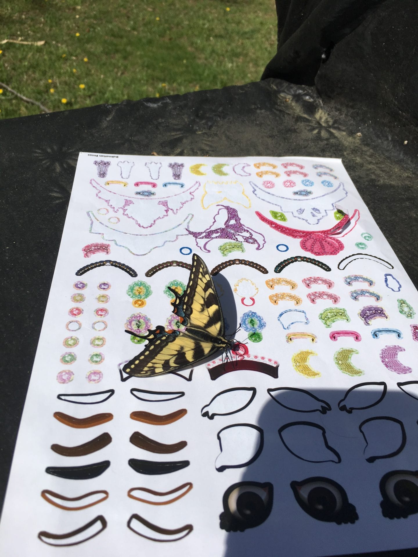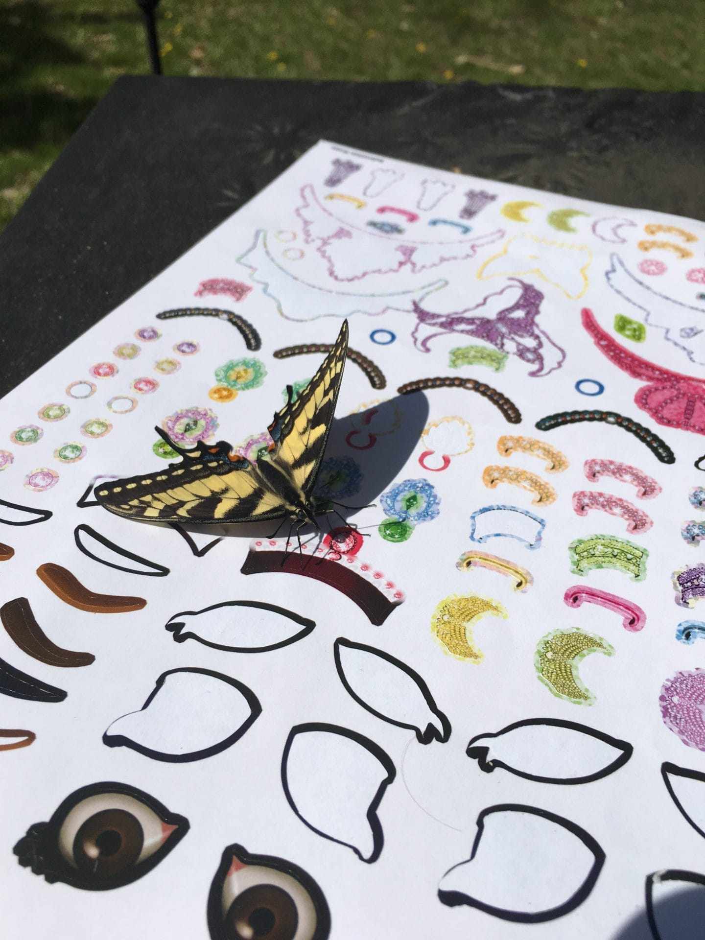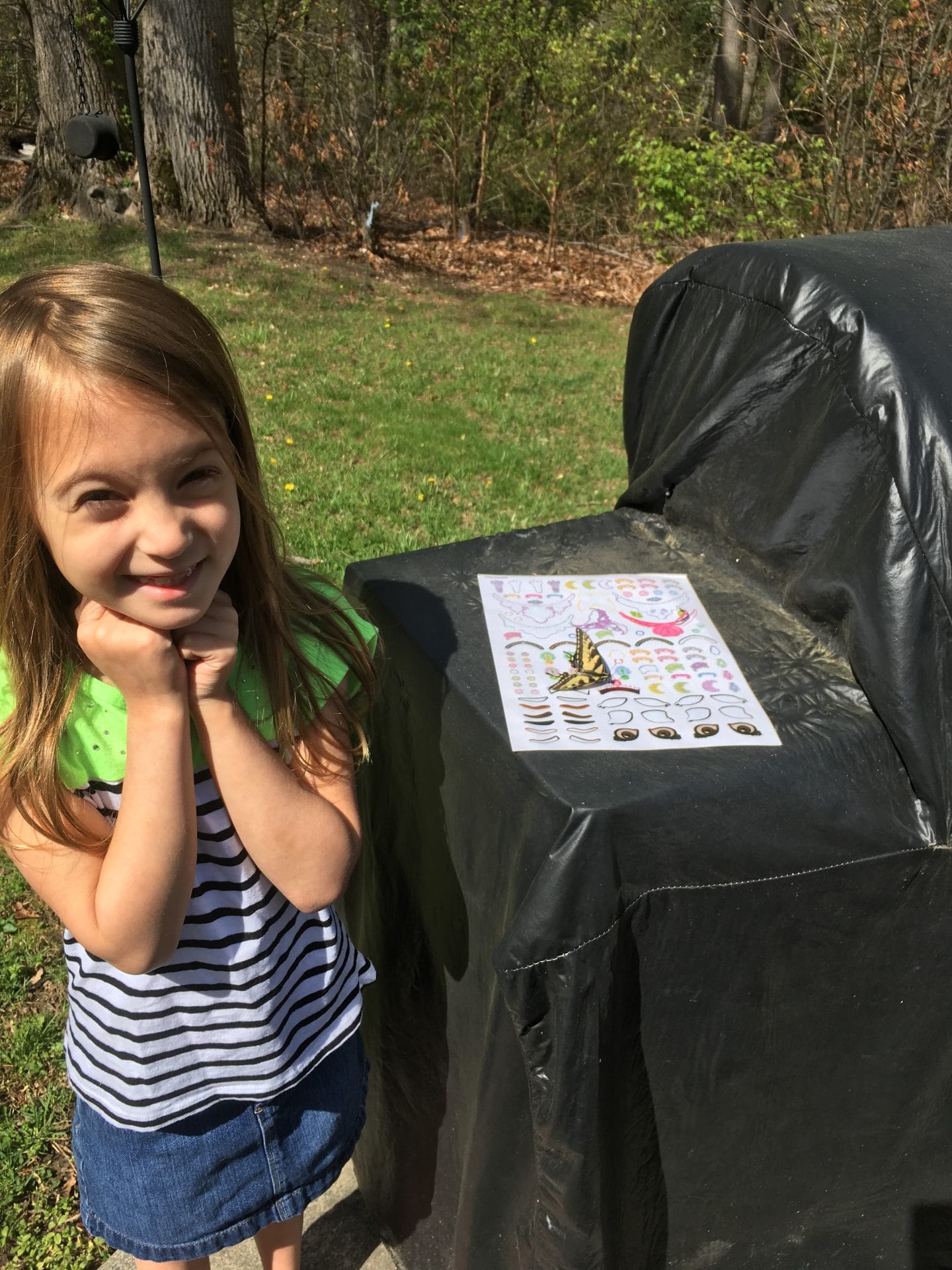Last night a butterfly slept on our sliding door. But it got cold and this morning we found him on the patio trying to warm up in the sun. But it was still shady. So Dad got one of my sticker book pages and moved him into sun on the grill. And I watched over him until he warmed up and flew away. He stopped on my pinwheel then flew to mommy’s lilac bush.