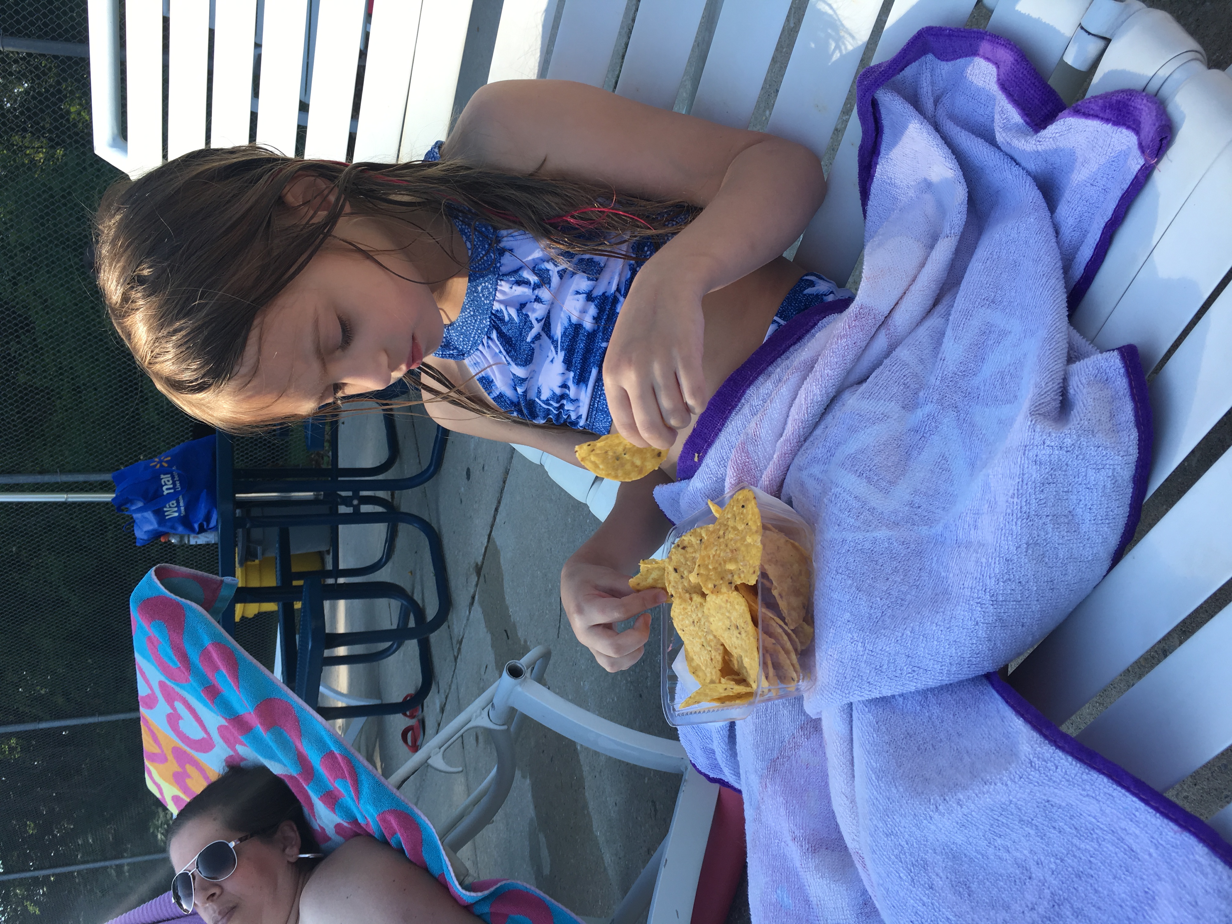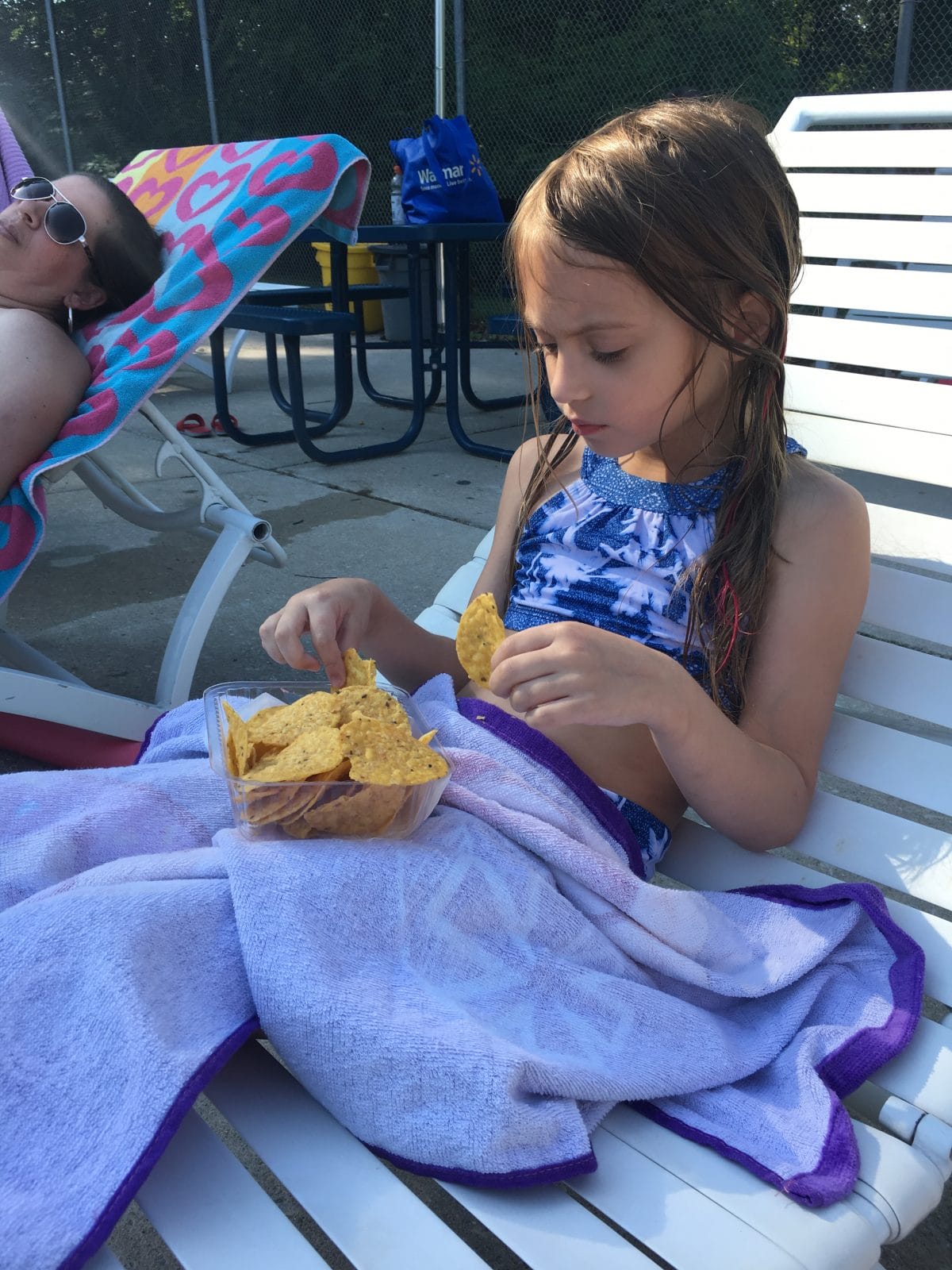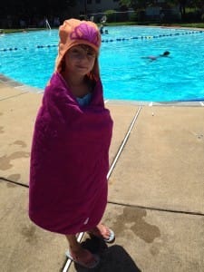 We took Belle to the dog park… and now it’s time for the pool! The water is cold. But it’s still fun.