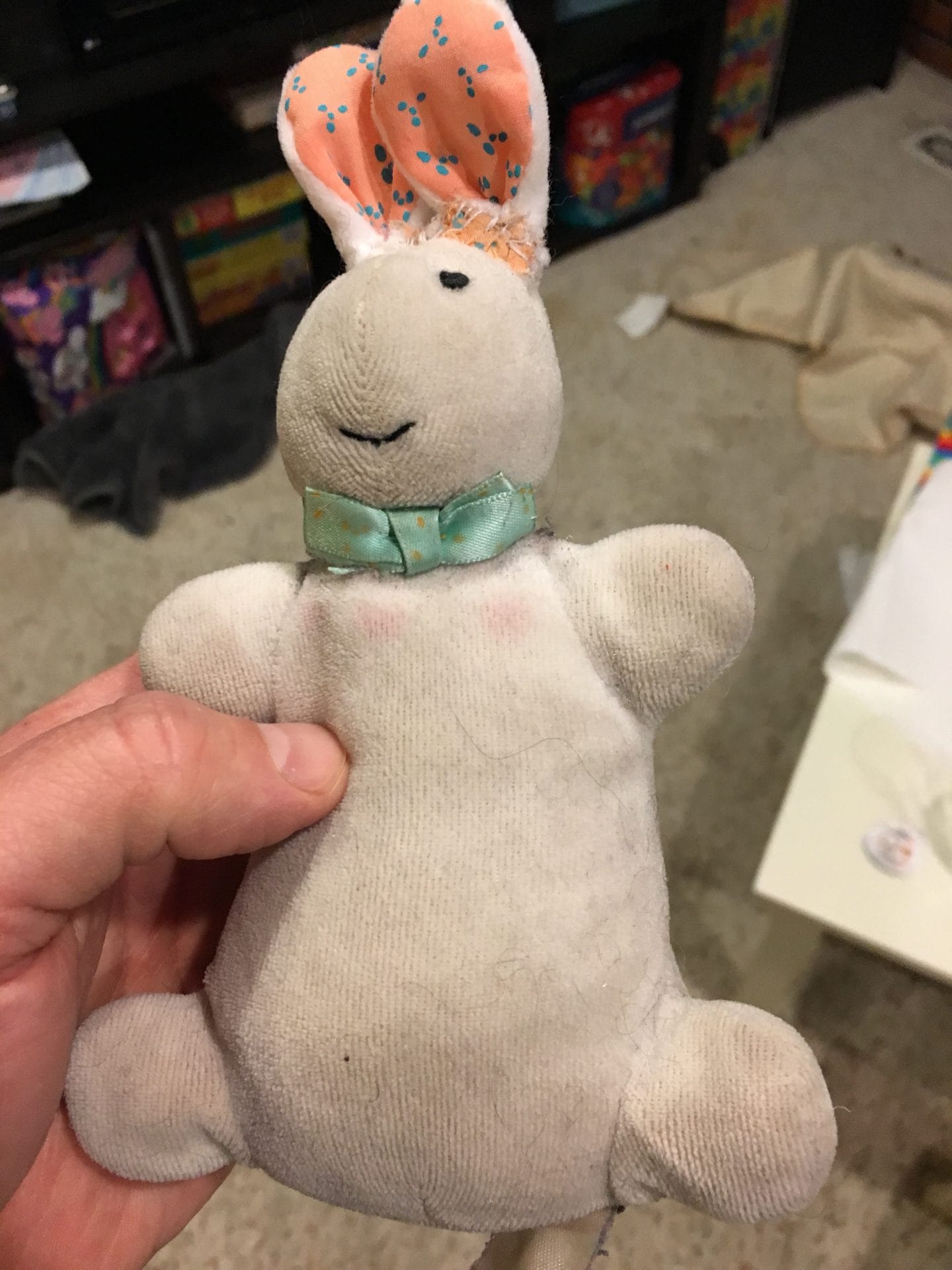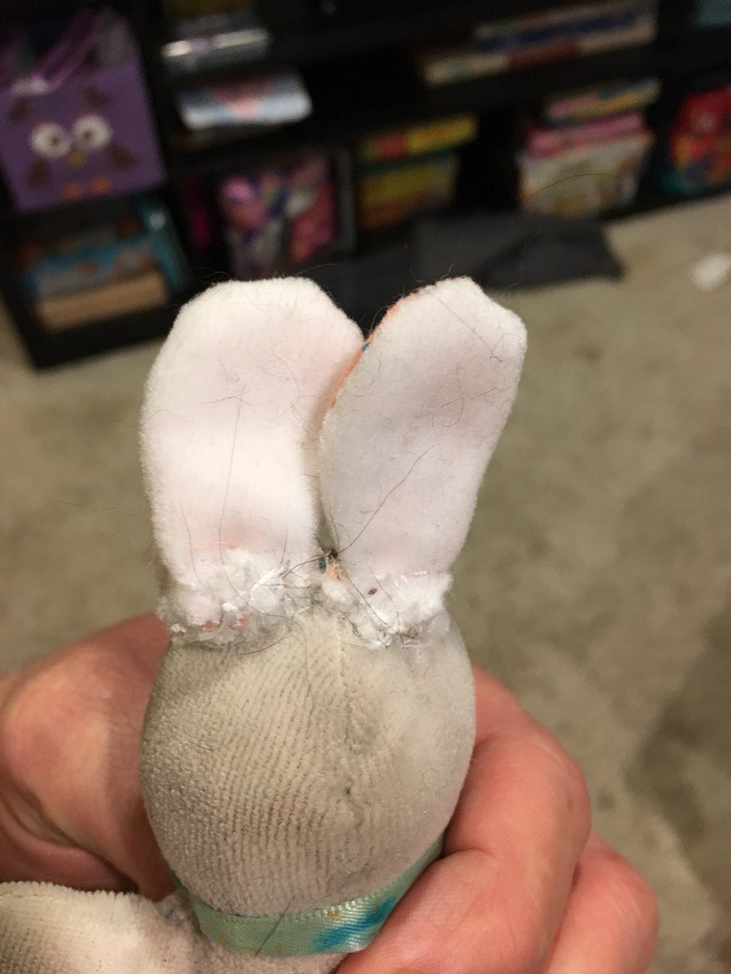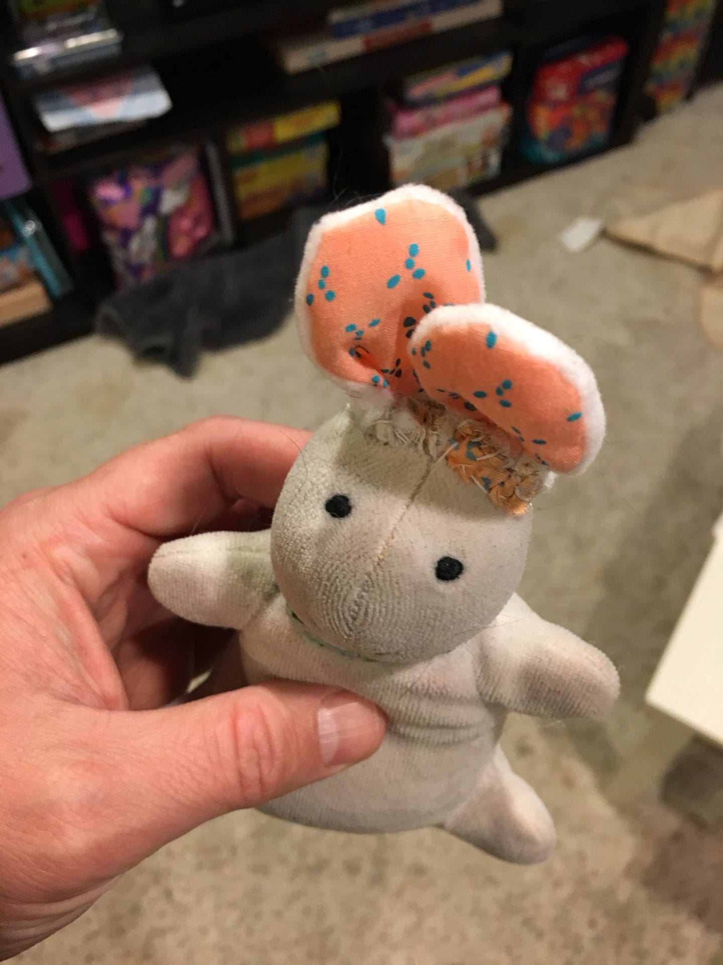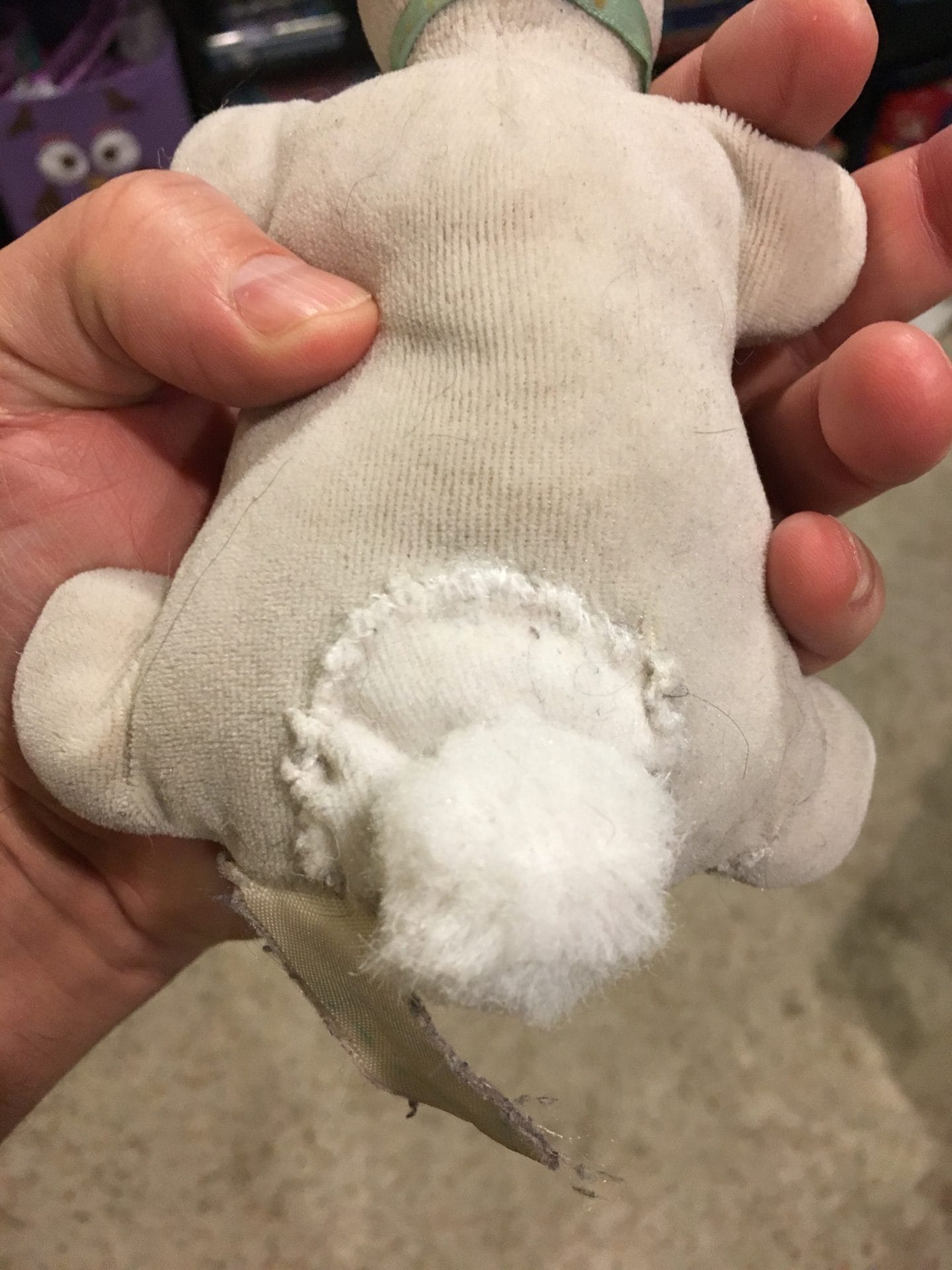 After another mauling by Belle, who I’m still very angry at, Dad rebuilt Pat for the third time. He’s got a few stitches and some scars but I still love him. I’ll sleep better tonight.