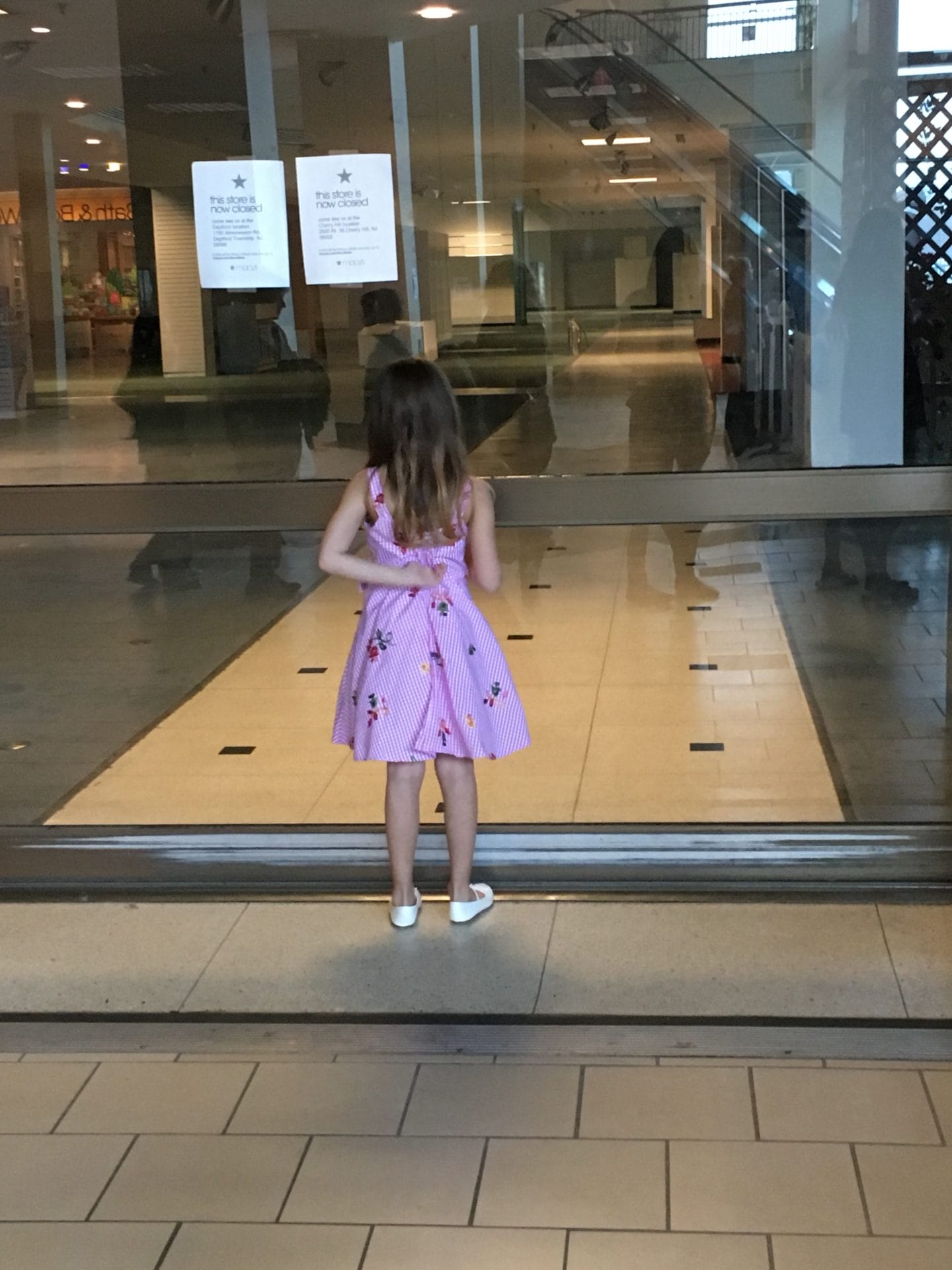 We’re waiting in line to visit the Easter Bunny, but this mall is pretty much empty. I can’t believe this giant empty store used to be Macy’s.